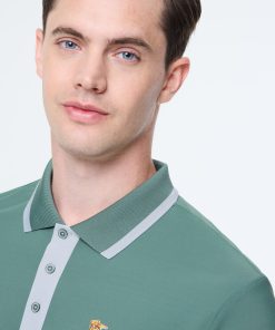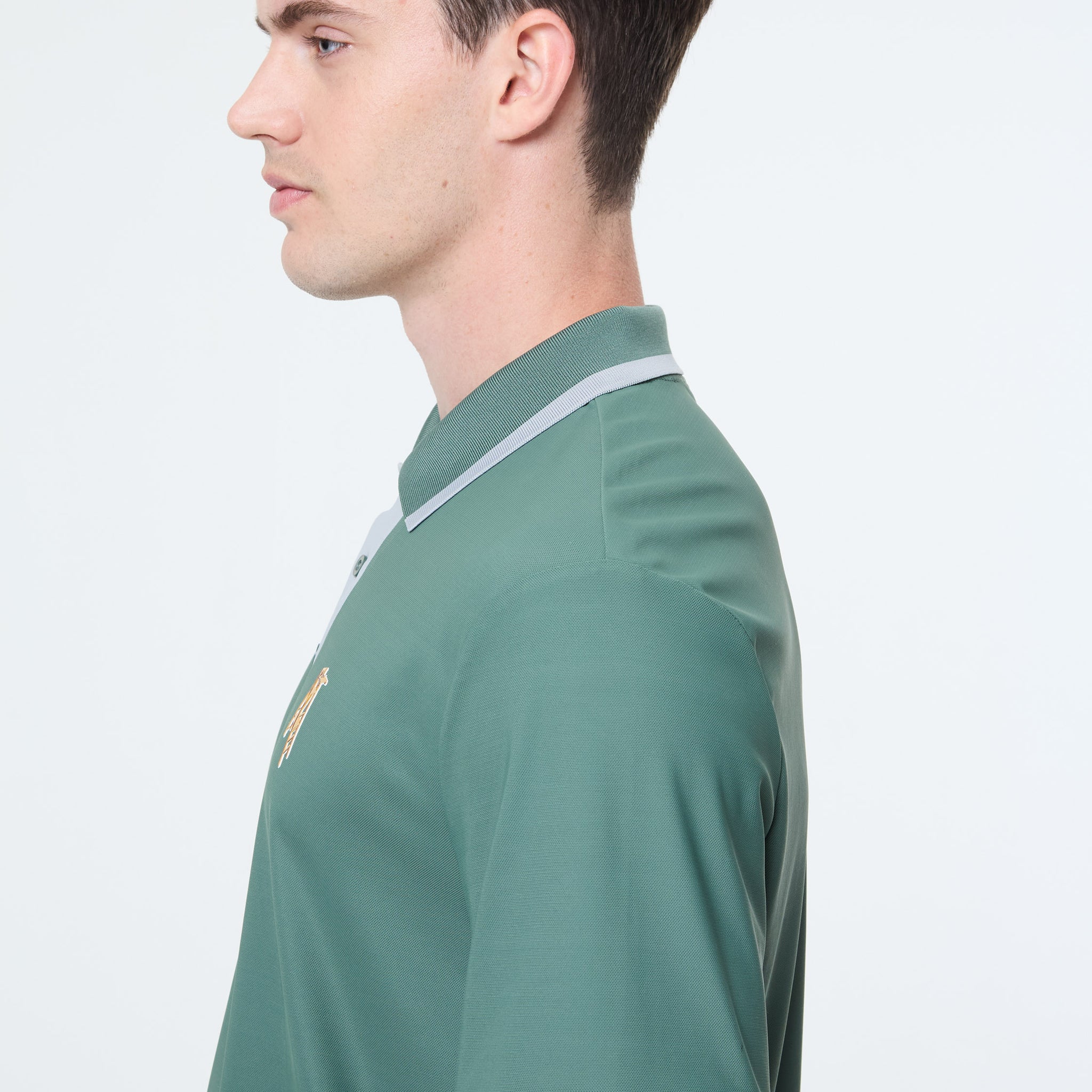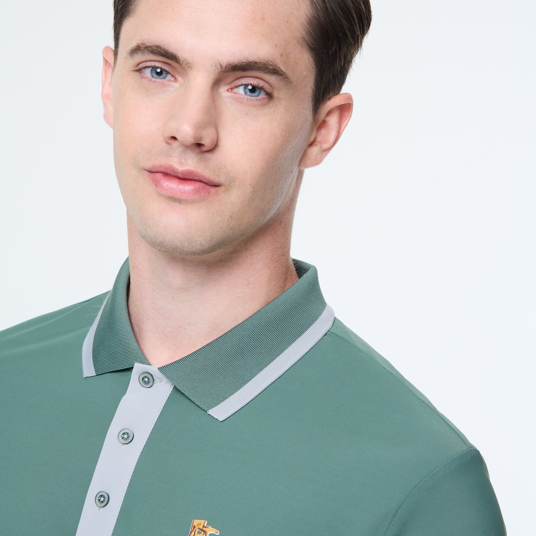 - 3-button contrast placket with custom branded buttons