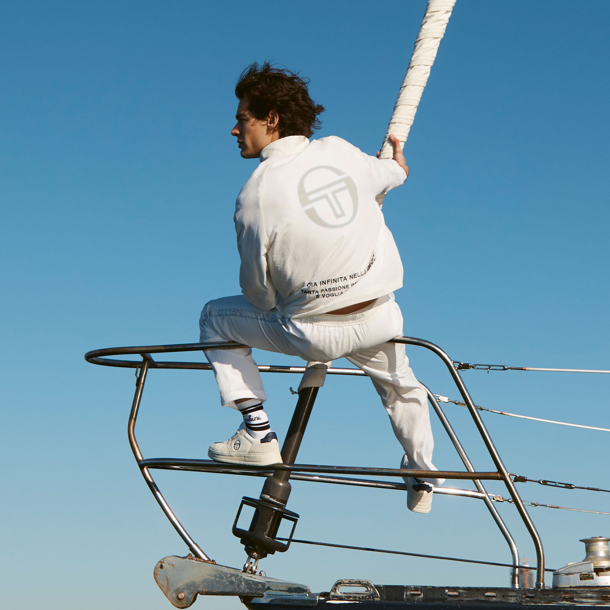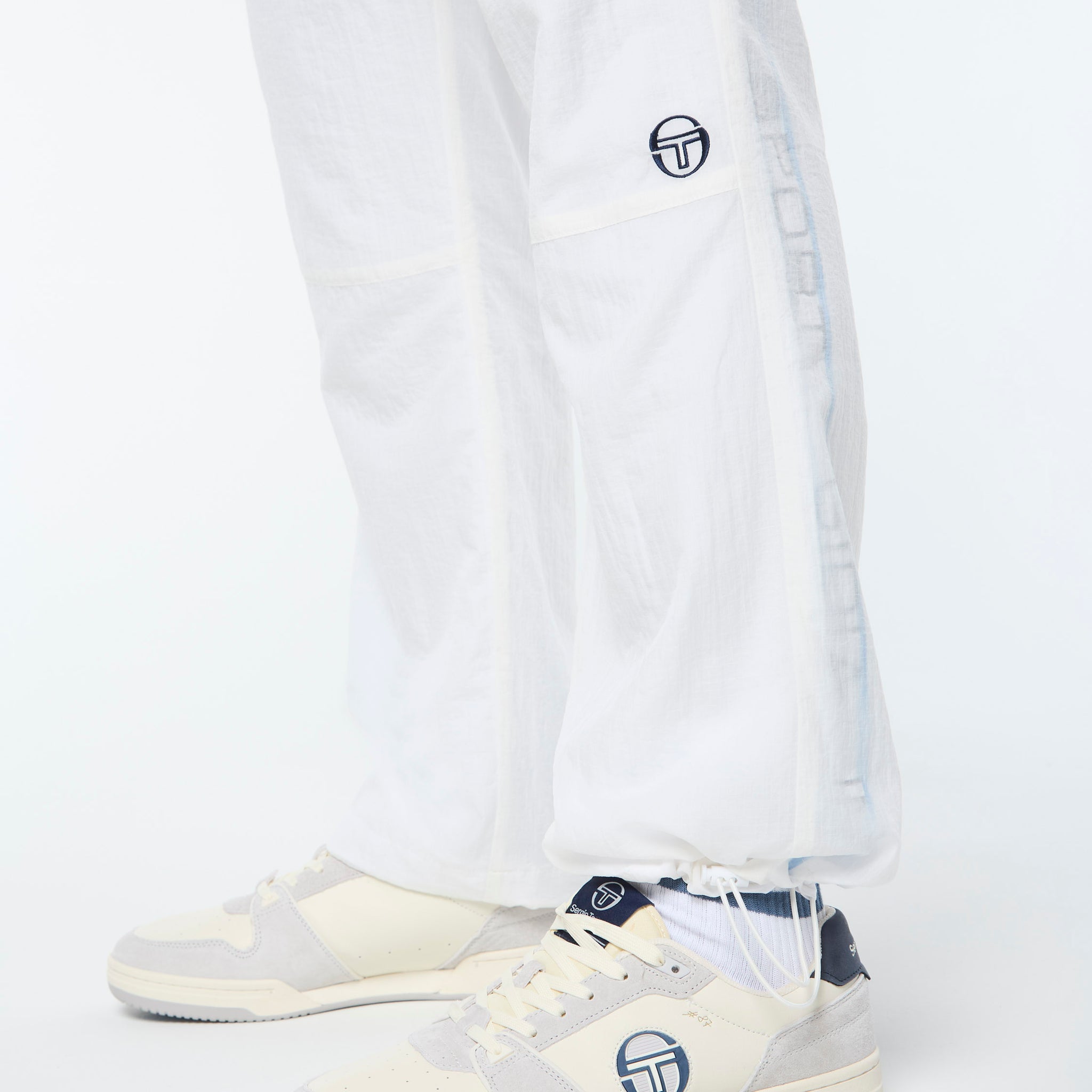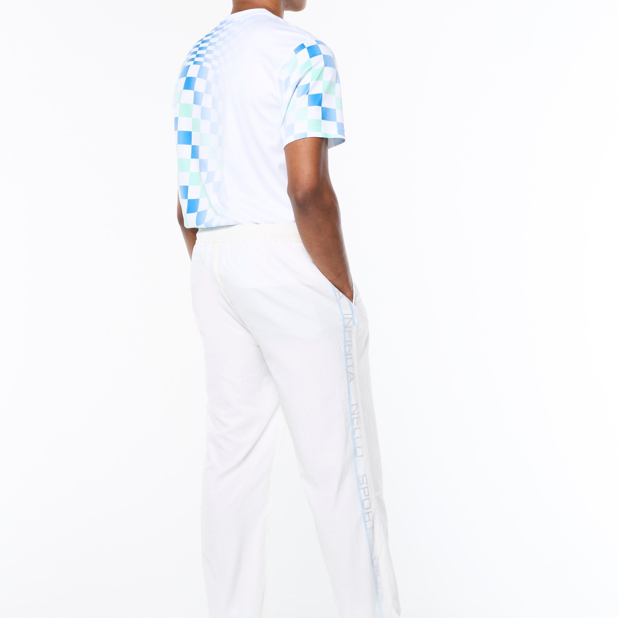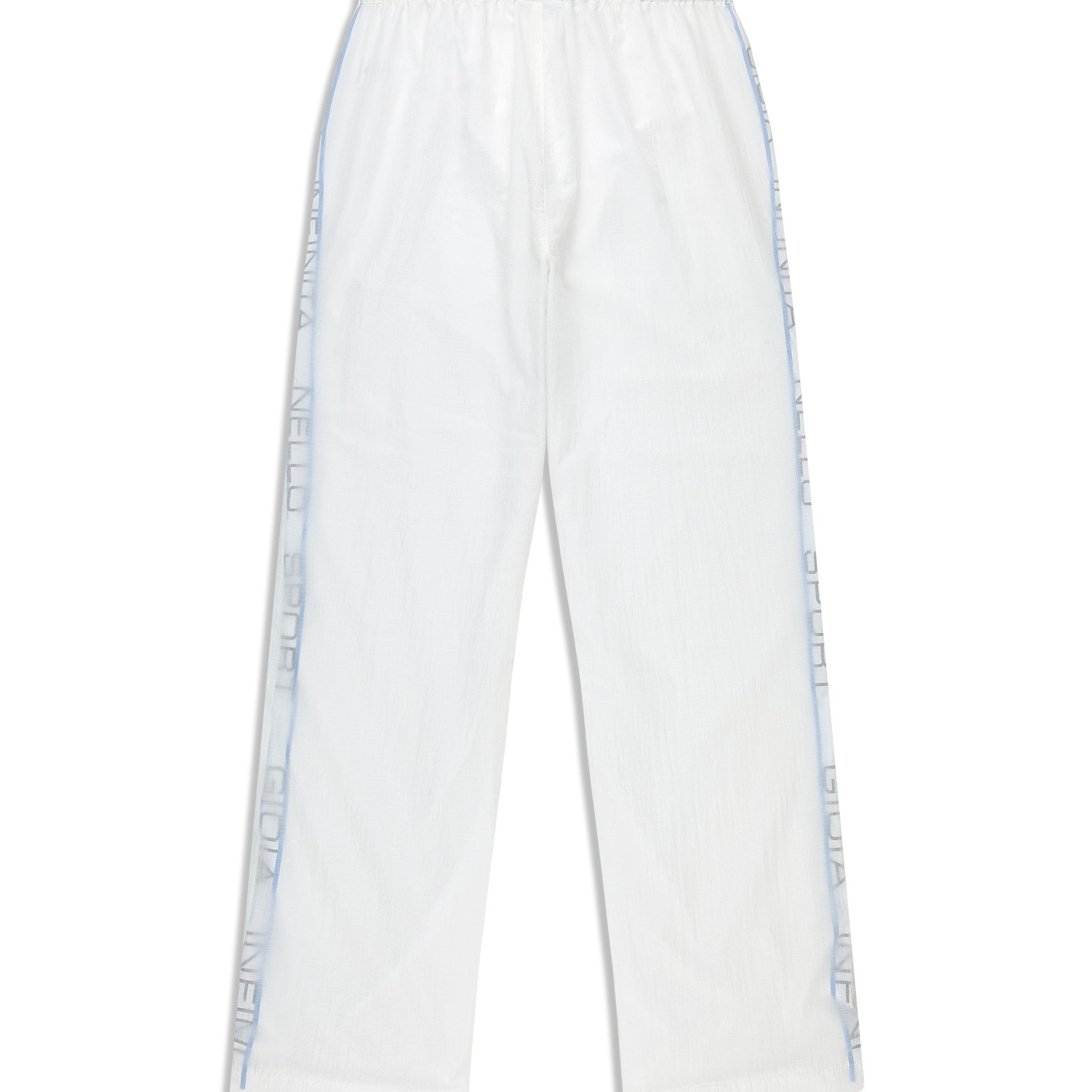 An elevated spin on classic athleticwear. The Faro Track Pant is crafted with a translucent stretch ripstop exterior featuring zip-secured pockets and an embroidered ‘ST’ monogram at the left knee. A solid inner lining boasts striped taping with a sports slogan repeat down the legs, creating a visual effect through the ripstop shell. Gioia infinita nello sport!
