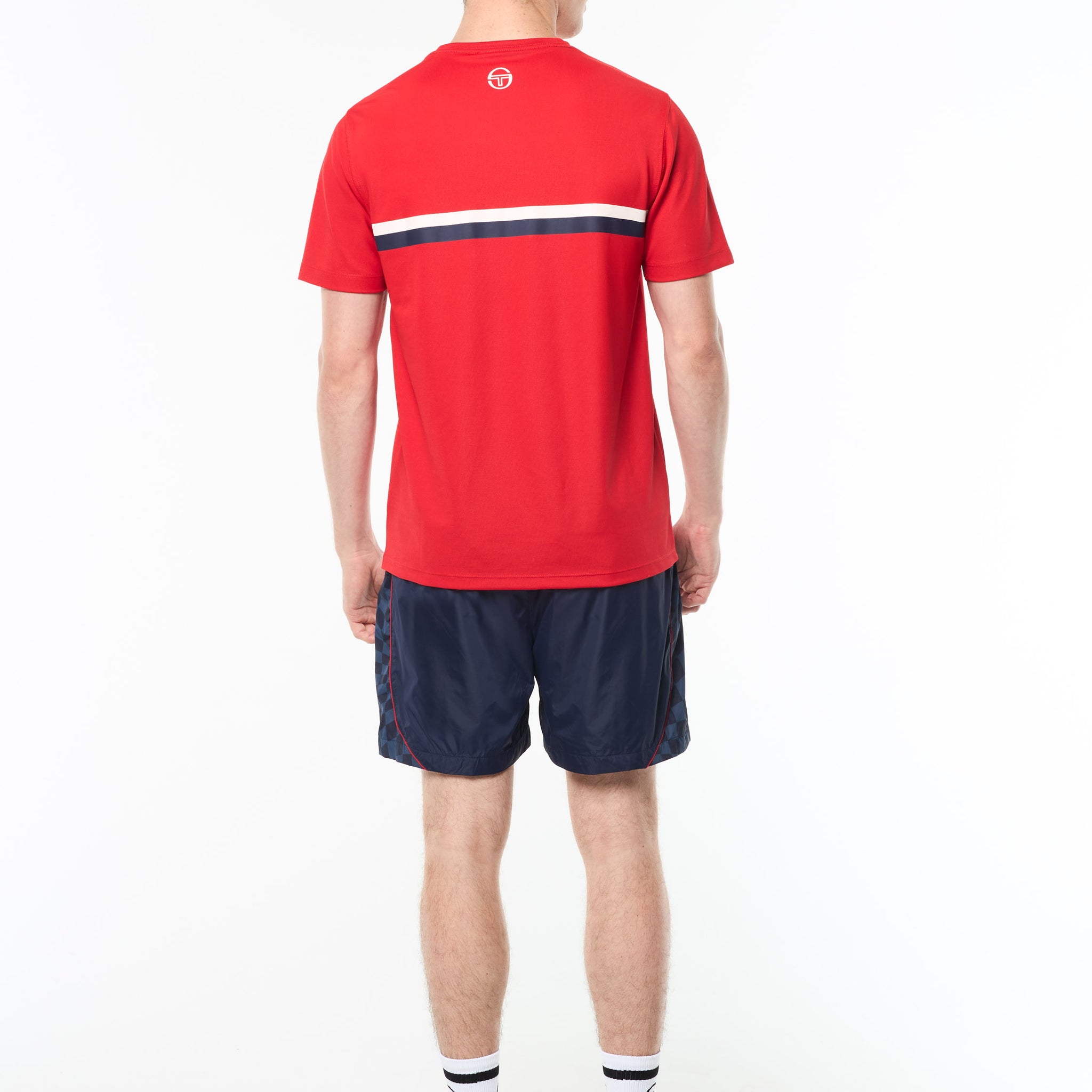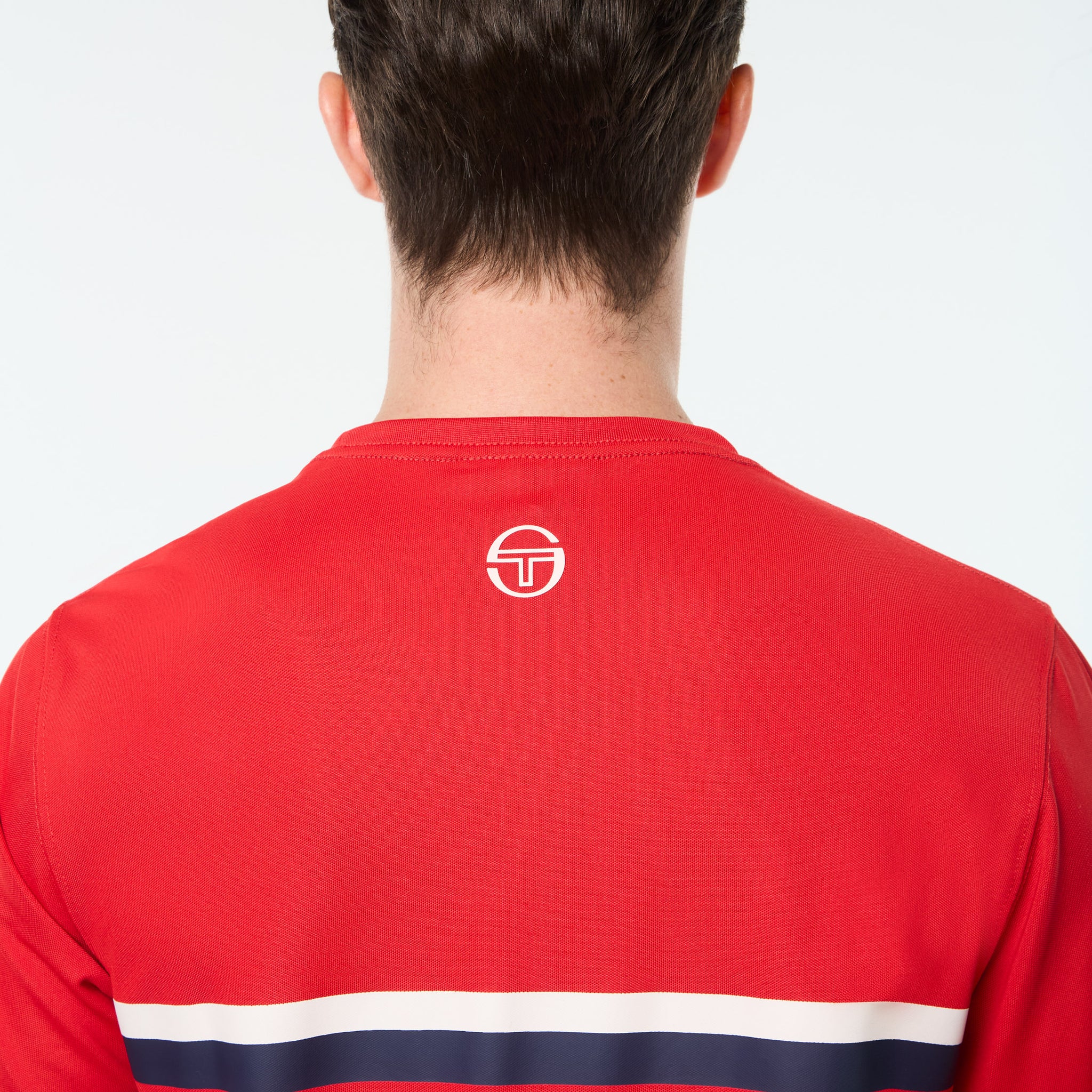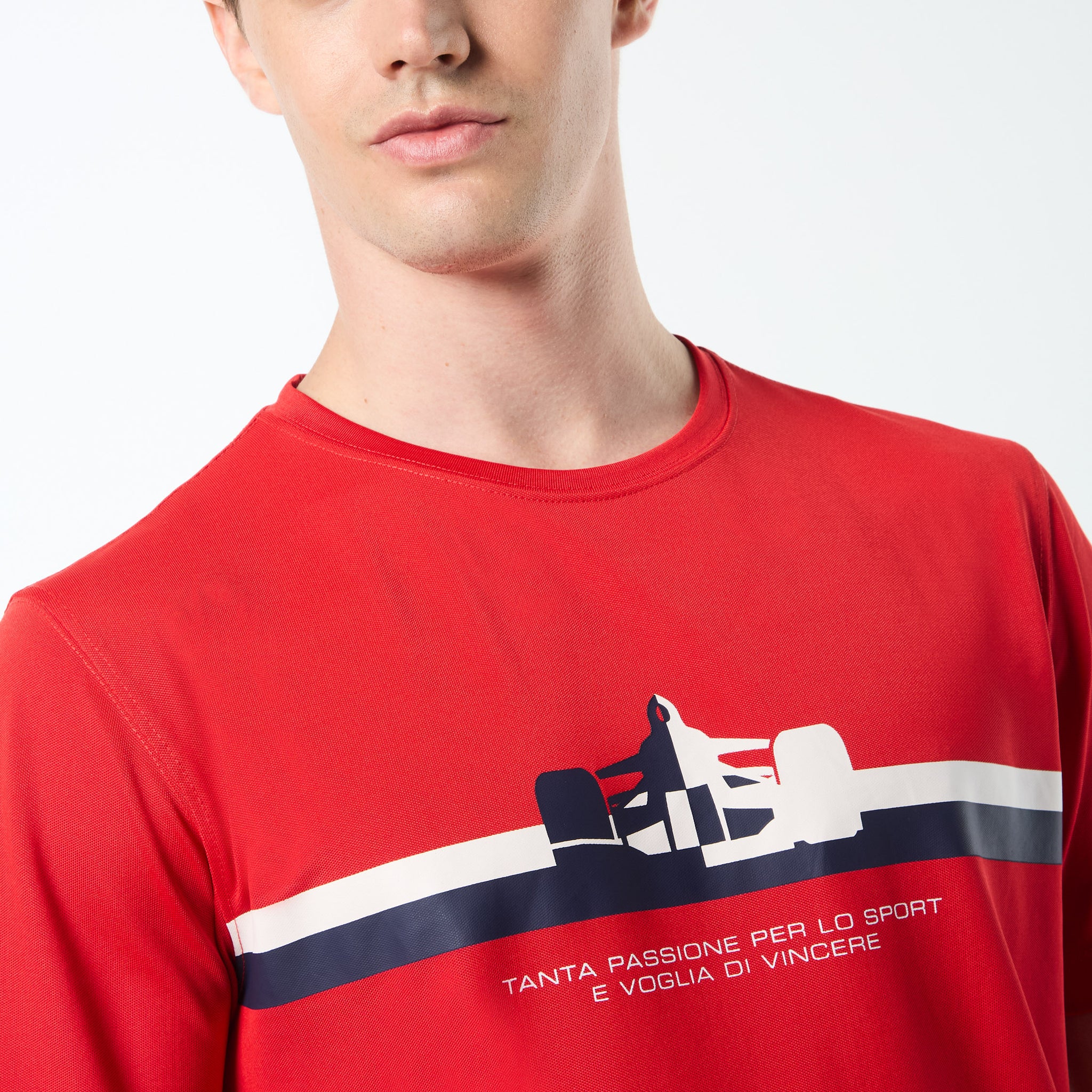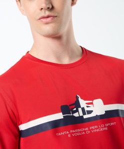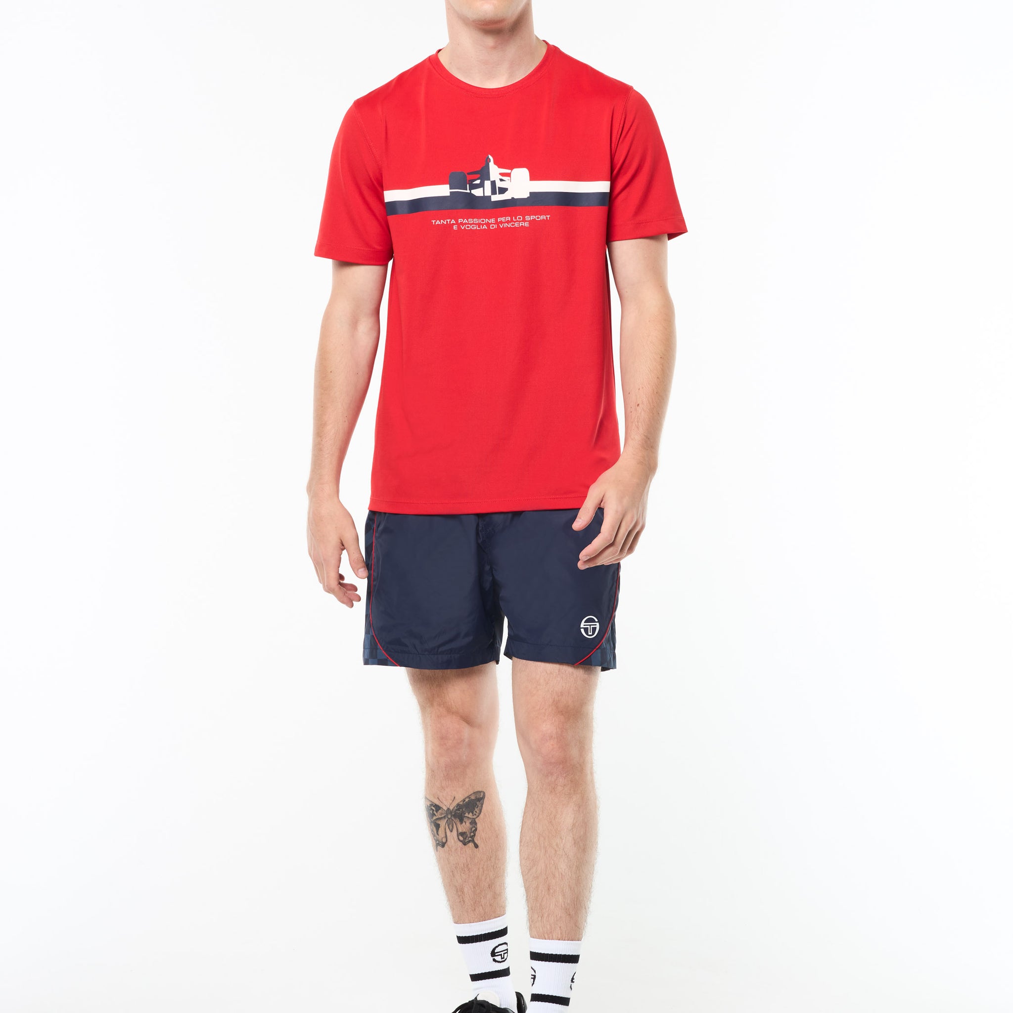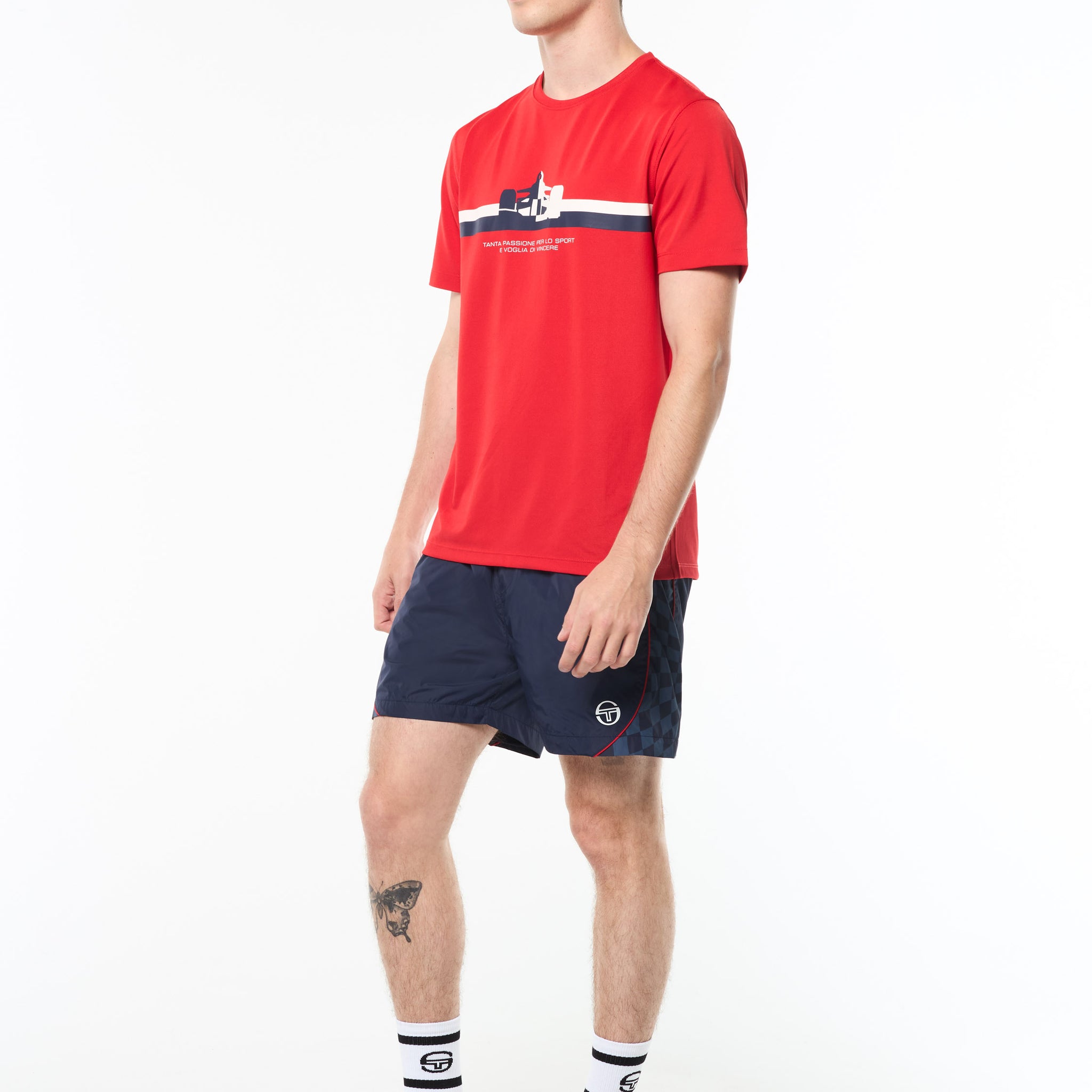 The Macchina T-Shirt is crafted from breathable stretch piqué fabric to keep you cool and moving freely throughout your day. Featuring custom Sergio Tacchini racing artwork, an Italian sports slogan, and stripe accents, this premium tee is perfect for both athletic pursuits and casual wear.