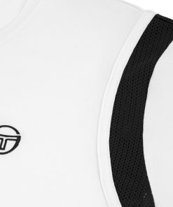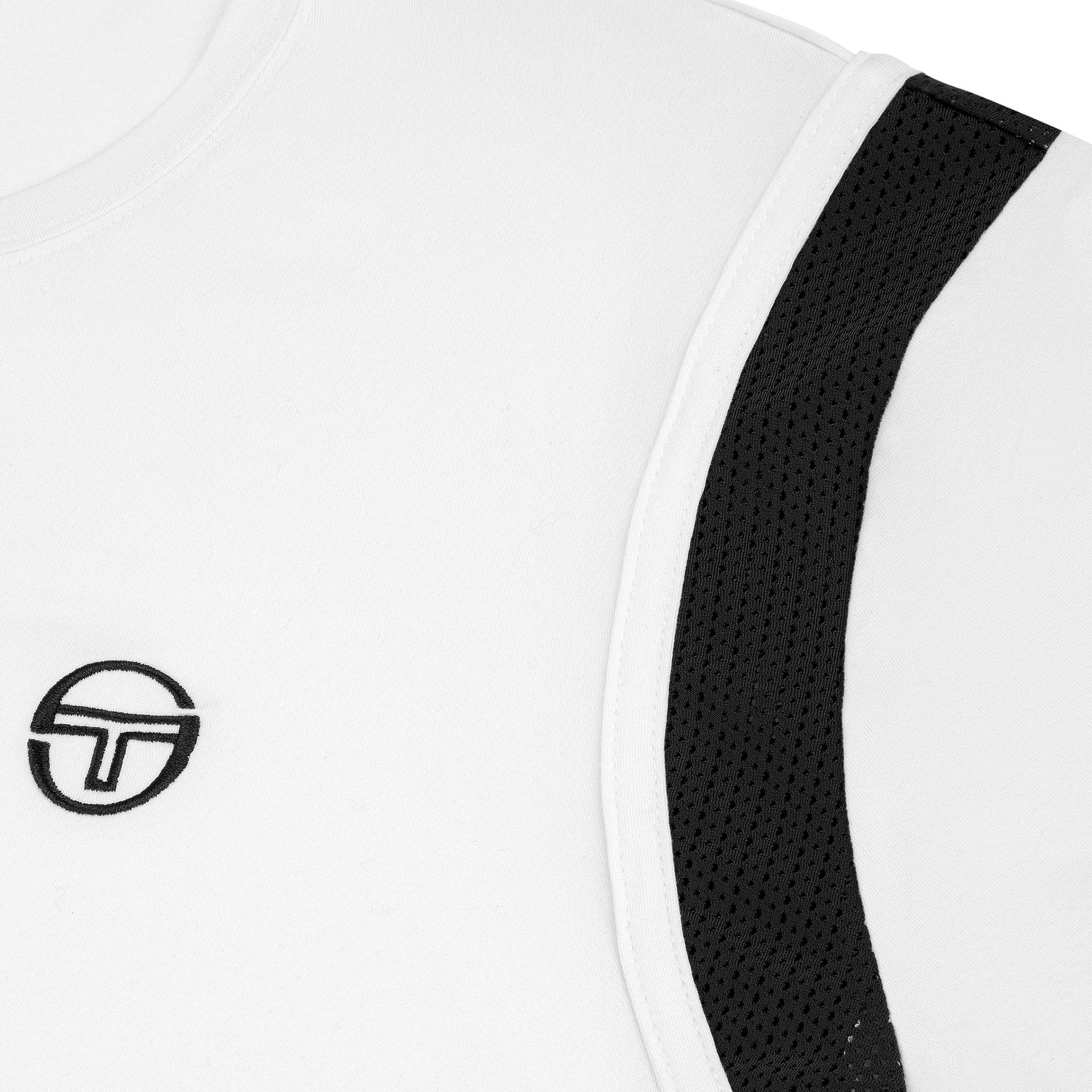 - Tennis net-inspired elastic mesh trim at sleeve seams and side body