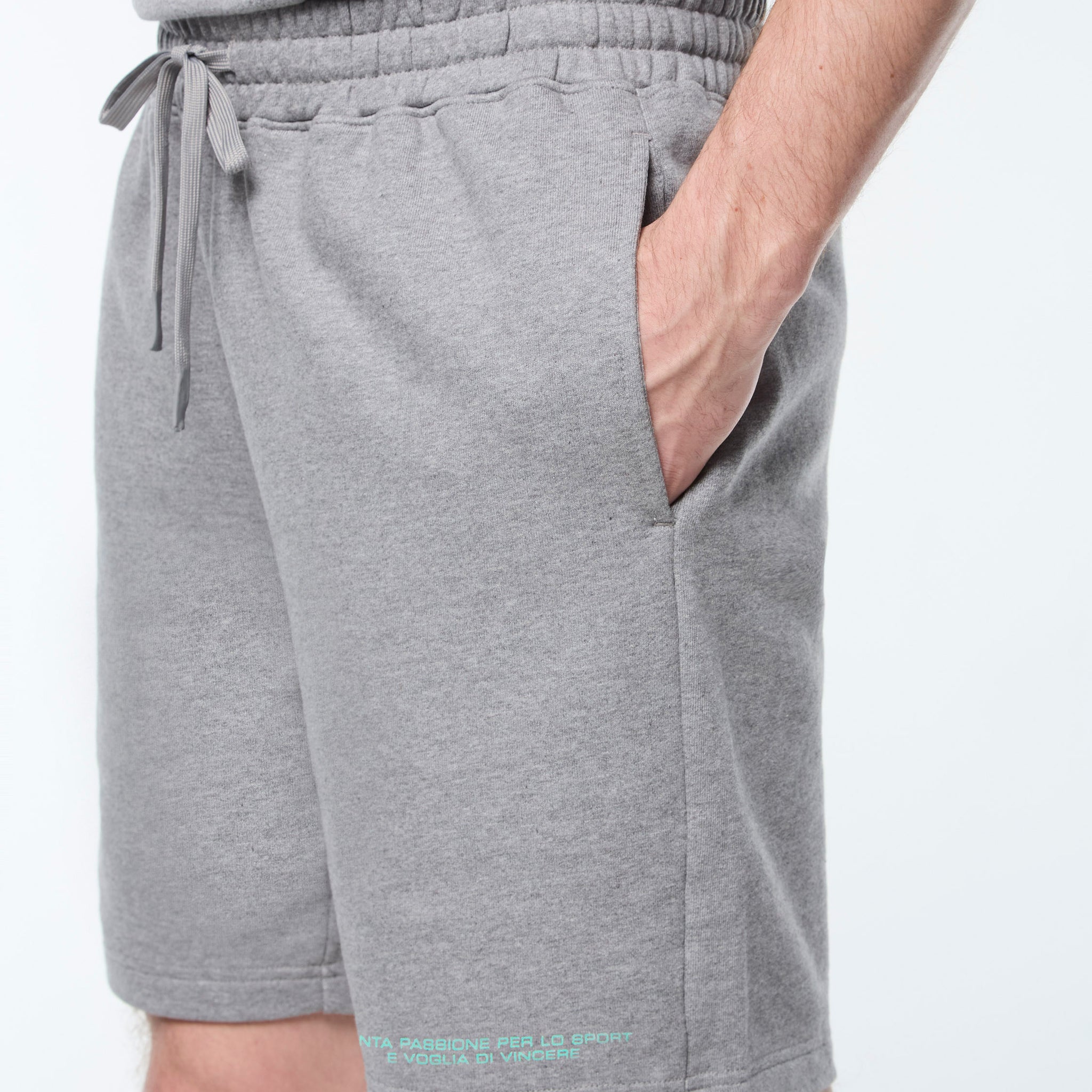 - Italian sports slogan in high shine print at left hem