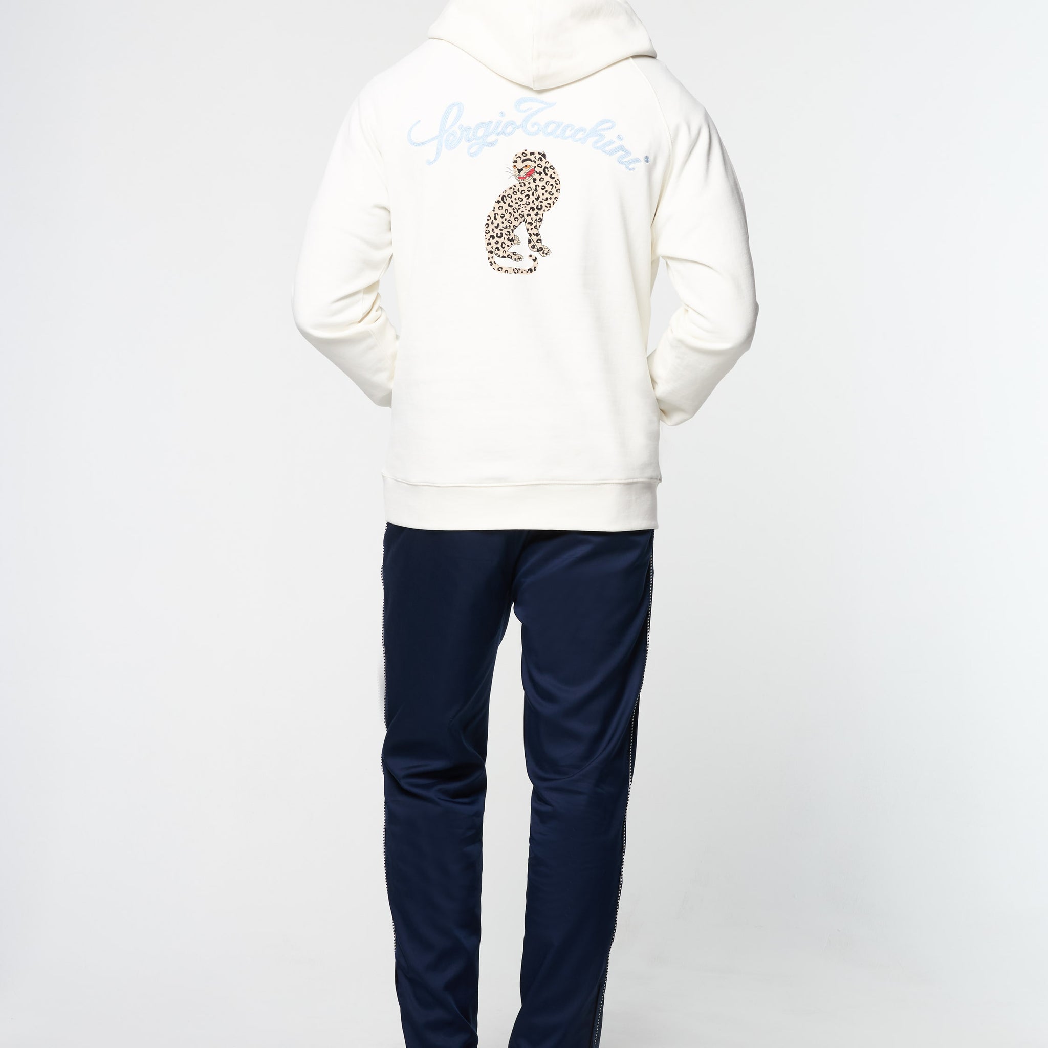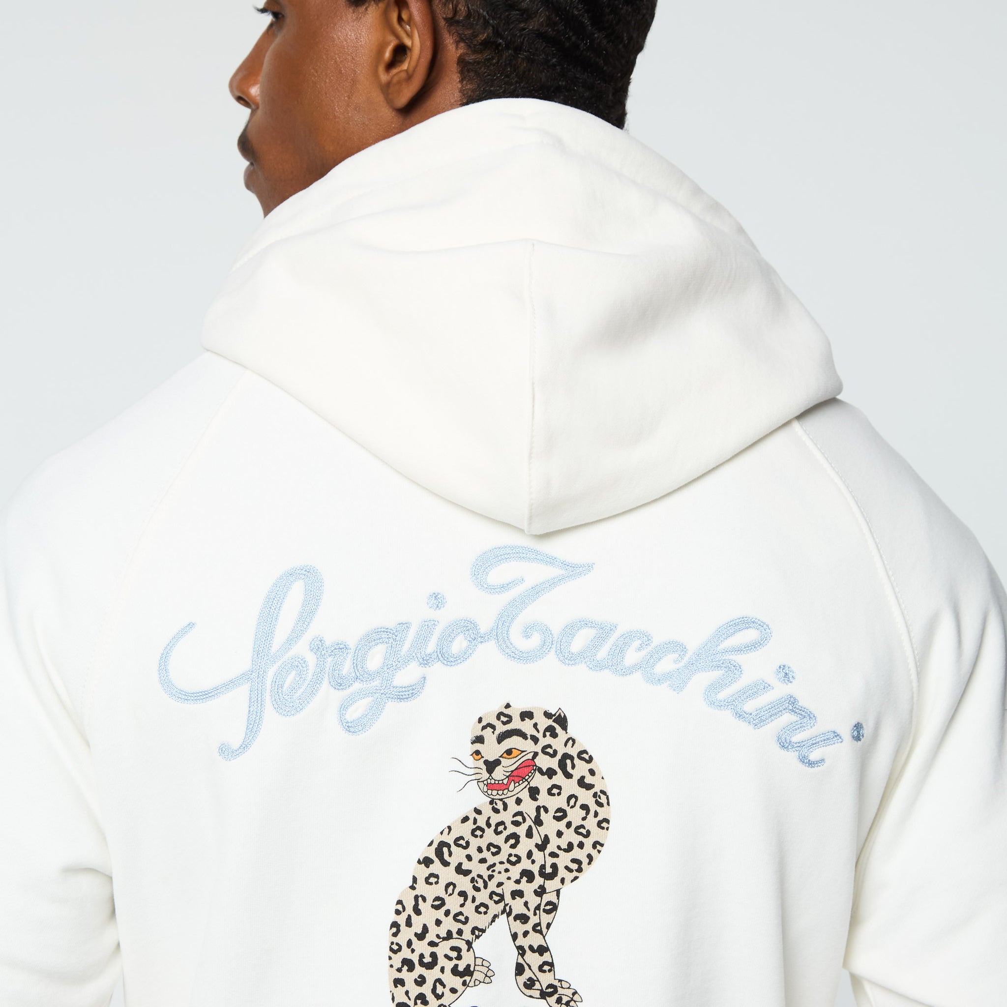 Made of premium French terry cotton, the Suveniri Hoodie features a chainstitched Sergio Tacchini script logo and printed snow leopard mascot at the back as a nod to vintage souvenir jackets. Finished with a spacious kangaroo handwarmer pocket and chainstitched logo at the chest, this elevated hoodie is part of our seasonal “Souvenir” capsule, inspired by European travel and discovery.