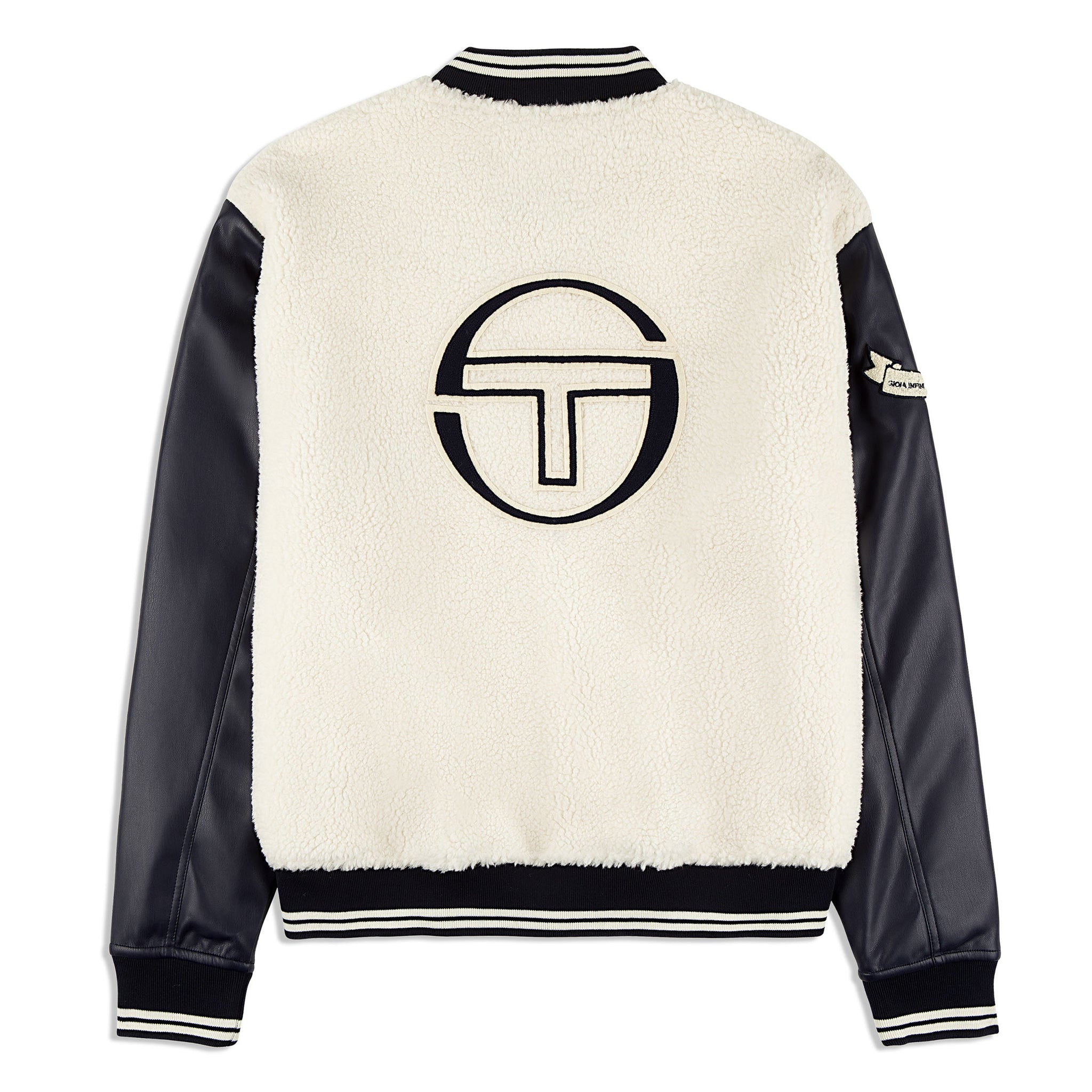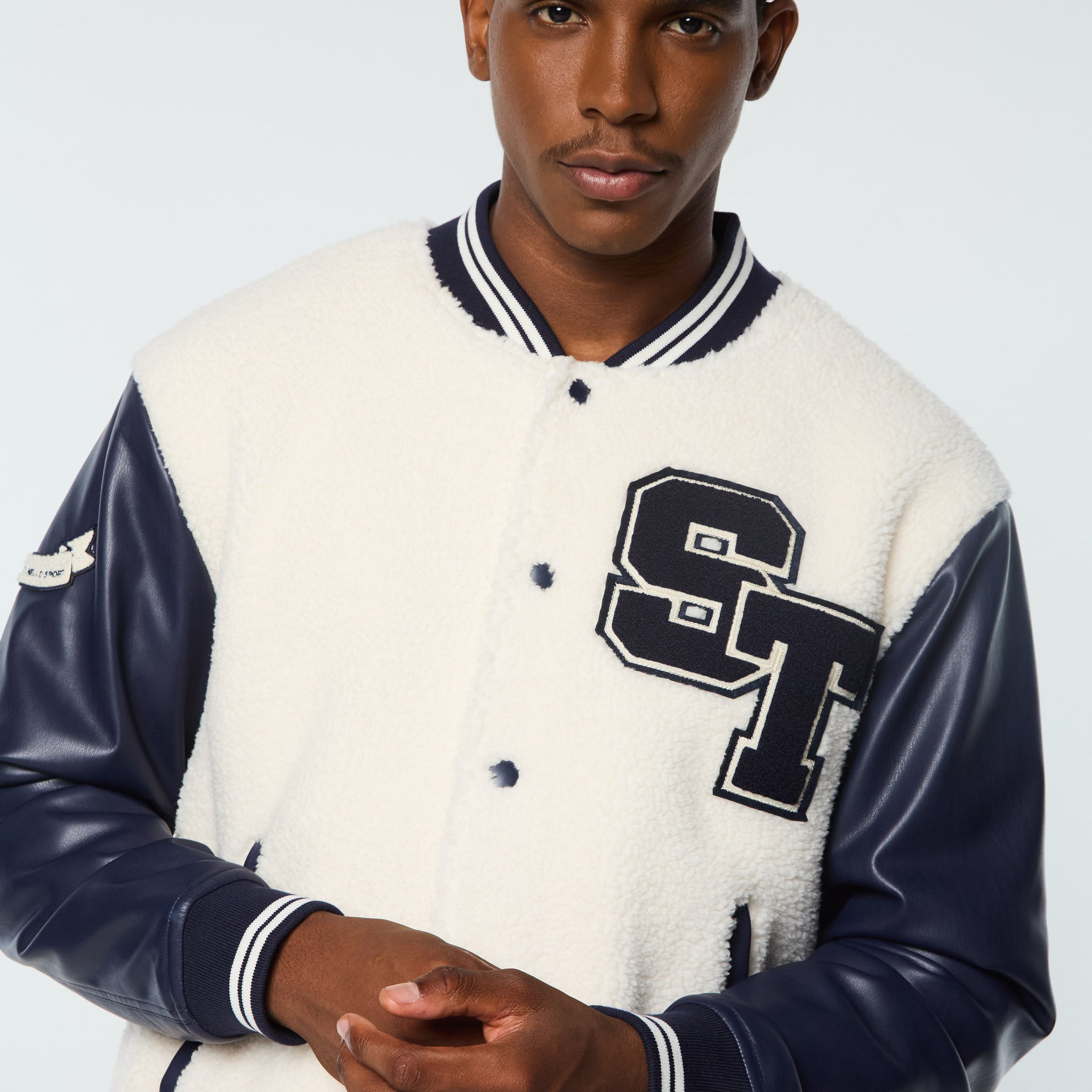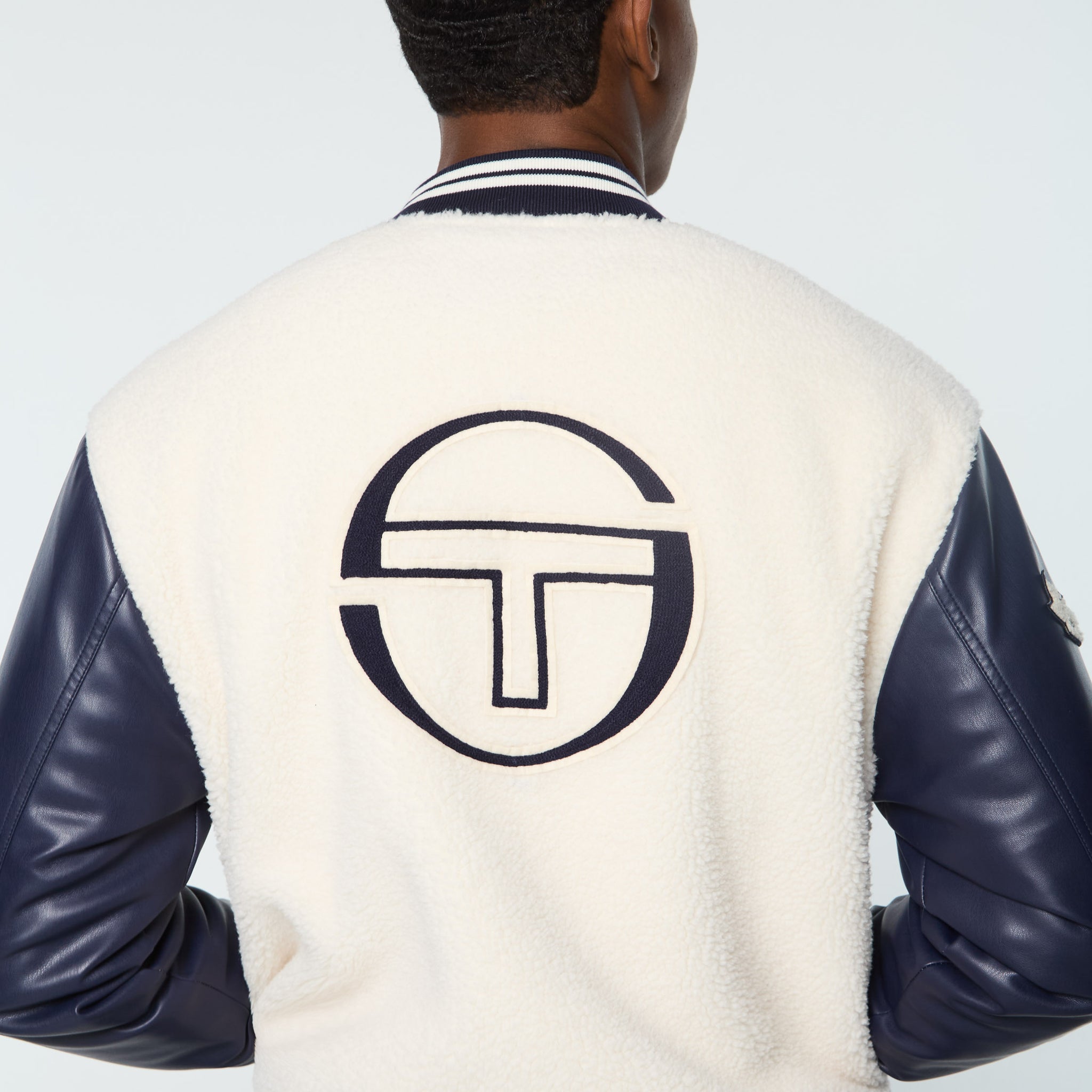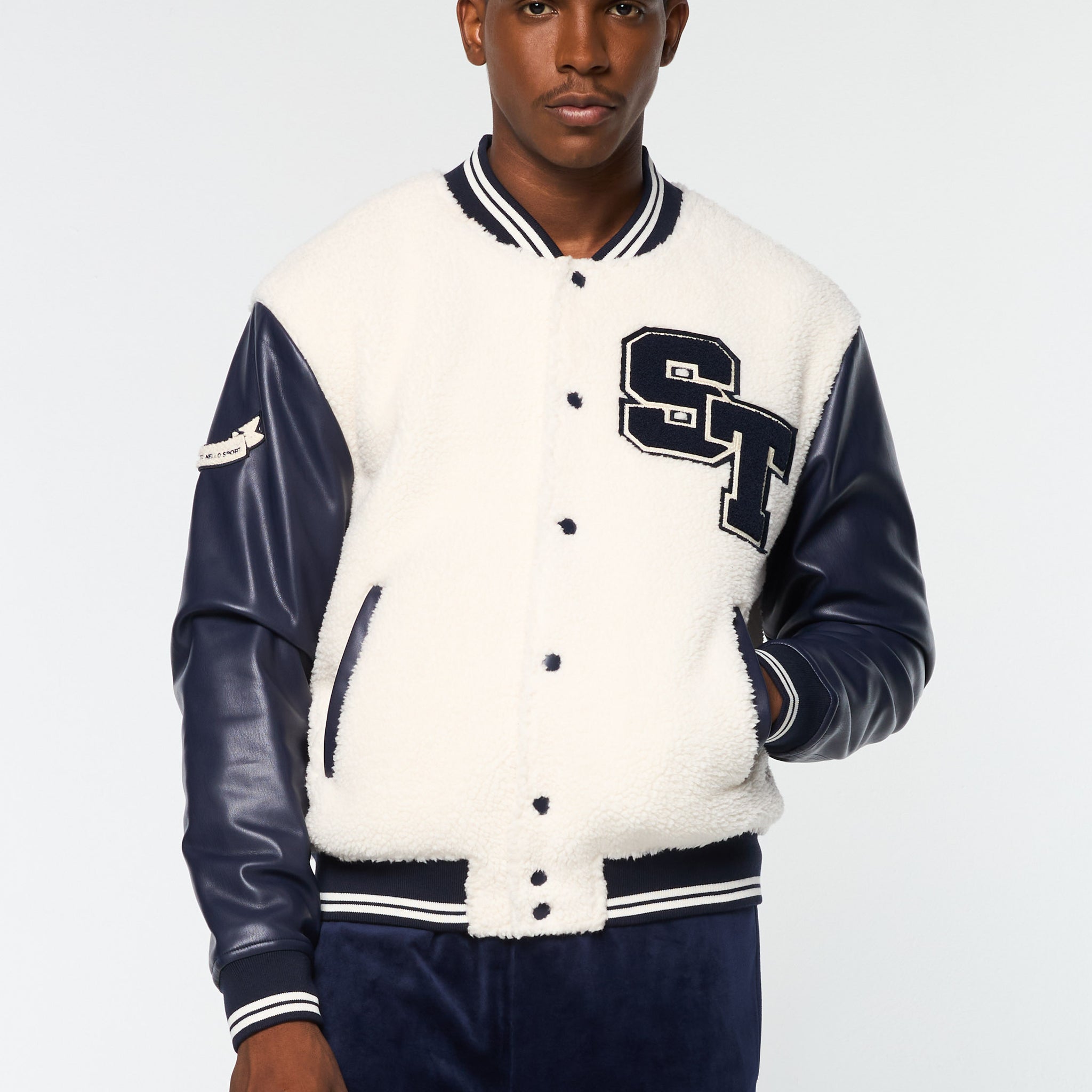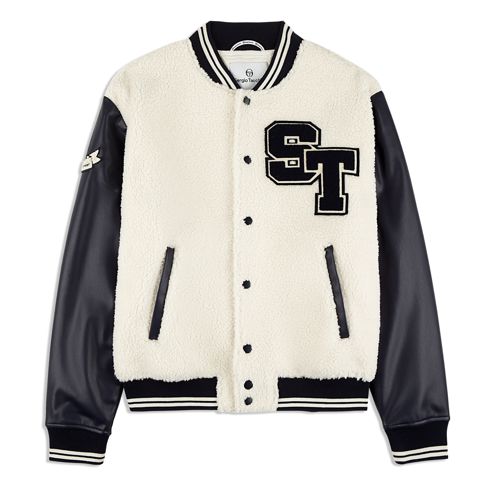 Crafted with a super warm faux sherpa body and faux leather sleeves, the Toppa Varsity Bomber features retro sportswear-inspired logo patches for a Tacchini spin on varsity athletic gear. Cut with a classic snap-button front and striped rib-knit trims, this premium varsity jacket is part of our seasonal “New Ivy” capsule—a contemporary take on collegiate prep aesthetics.