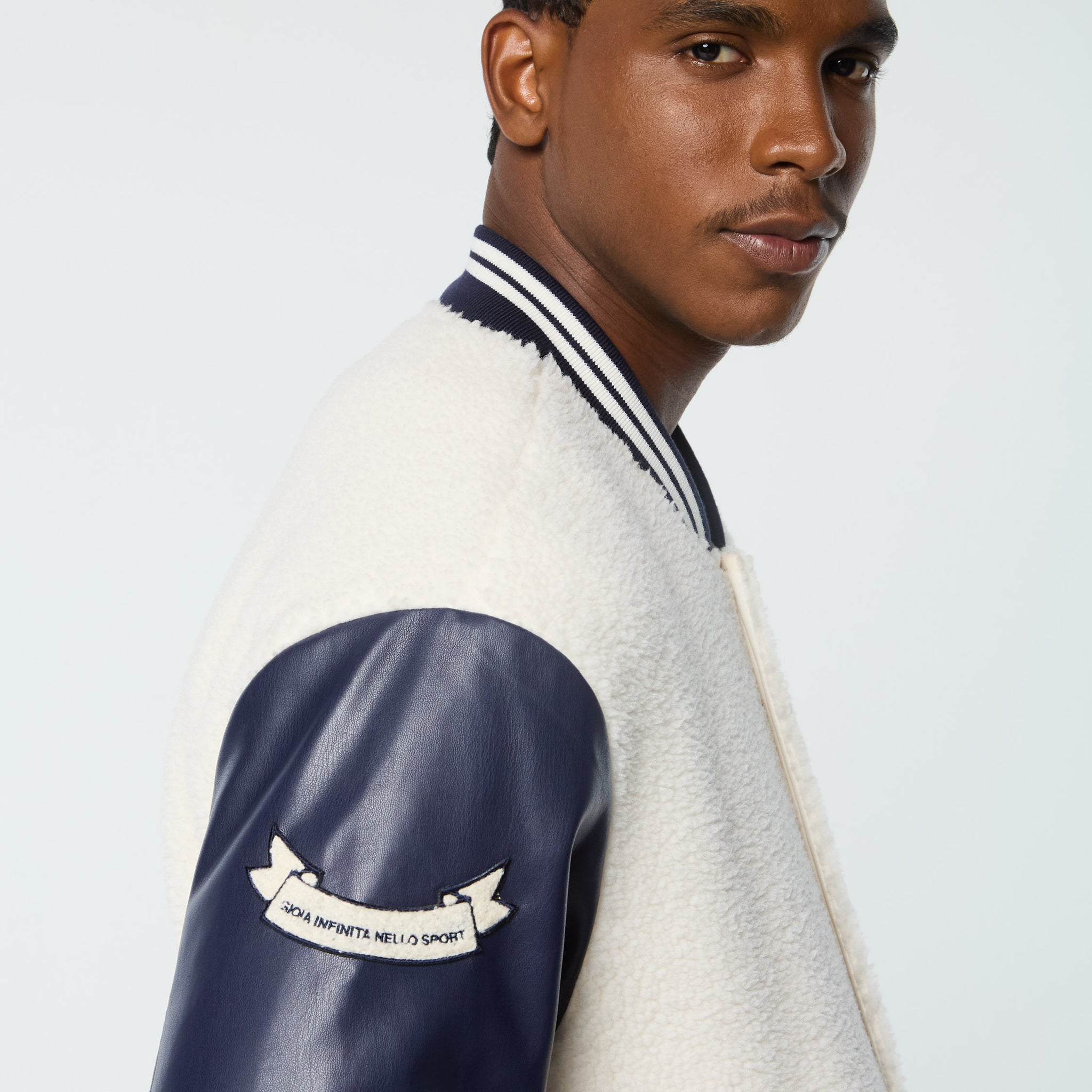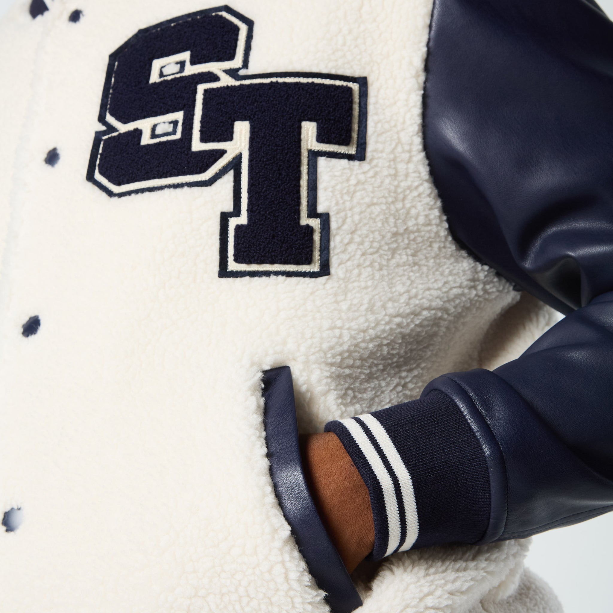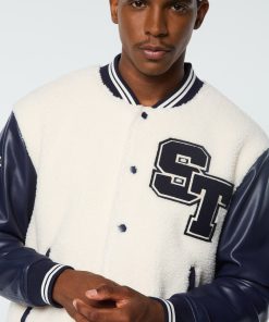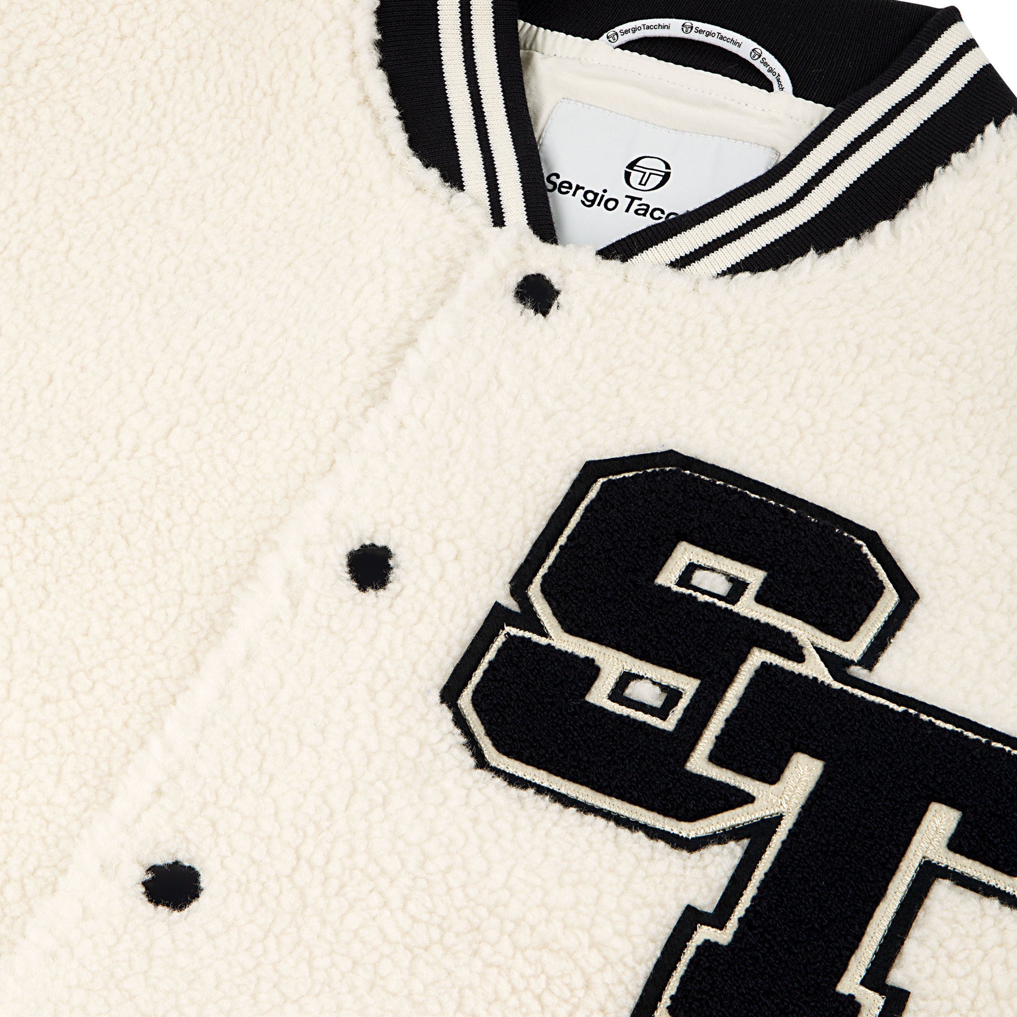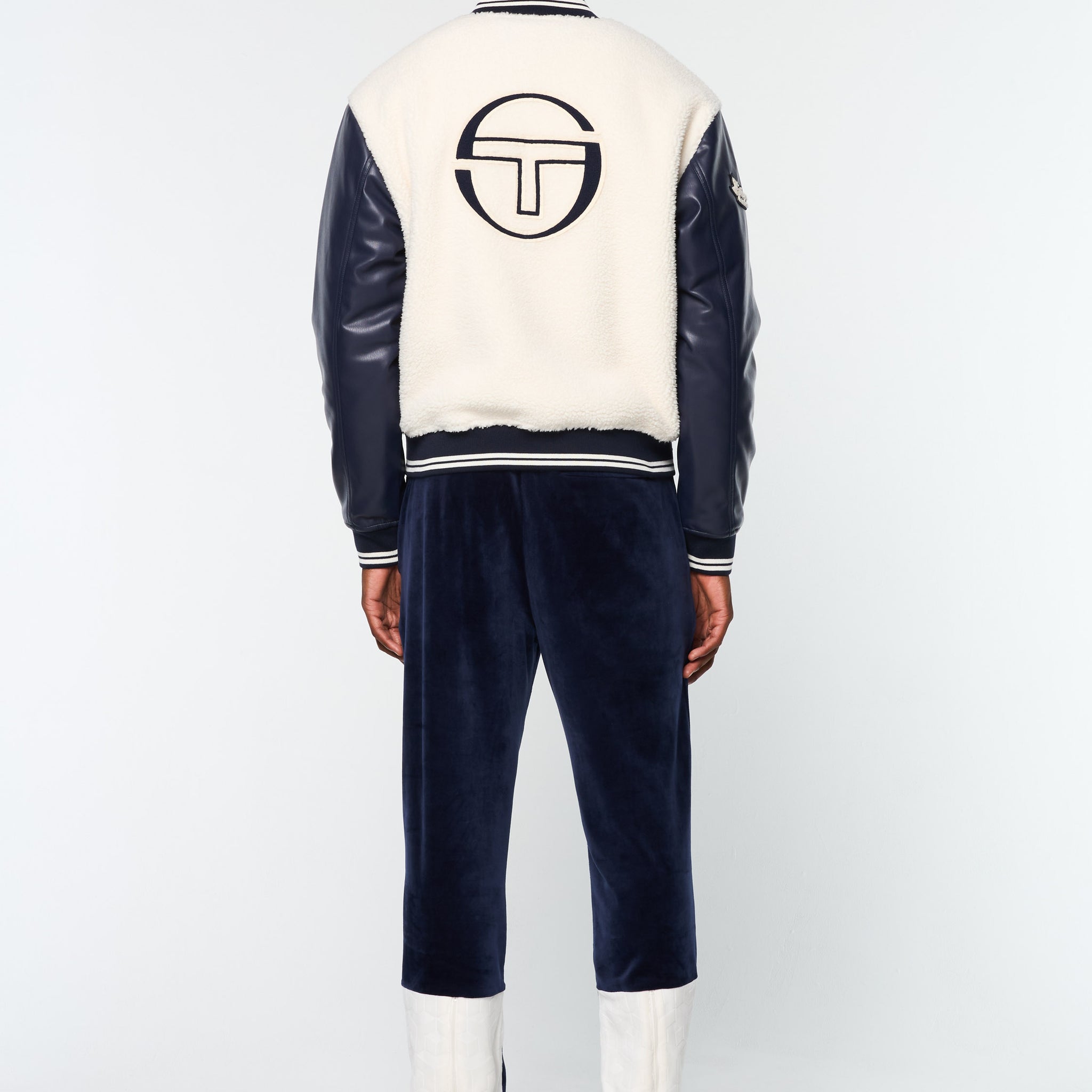Crafted with a super warm faux sherpa body and faux leather sleeves, the Toppa Varsity Bomber features retro sportswear-inspired logo patches for a Tacchini spin on varsity athletic gear. Cut with a classic snap-button front and striped rib-knit trims, this premium varsity jacket is part of our seasonal “New Ivy” capsule—a contemporary take on collegiate prep aesthetics.