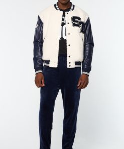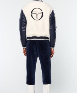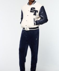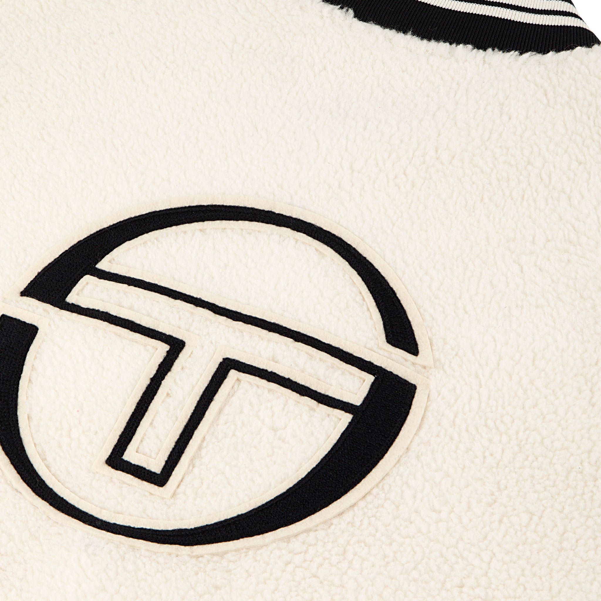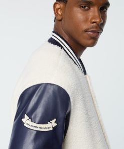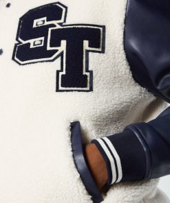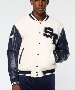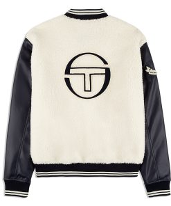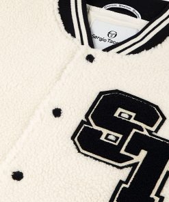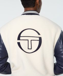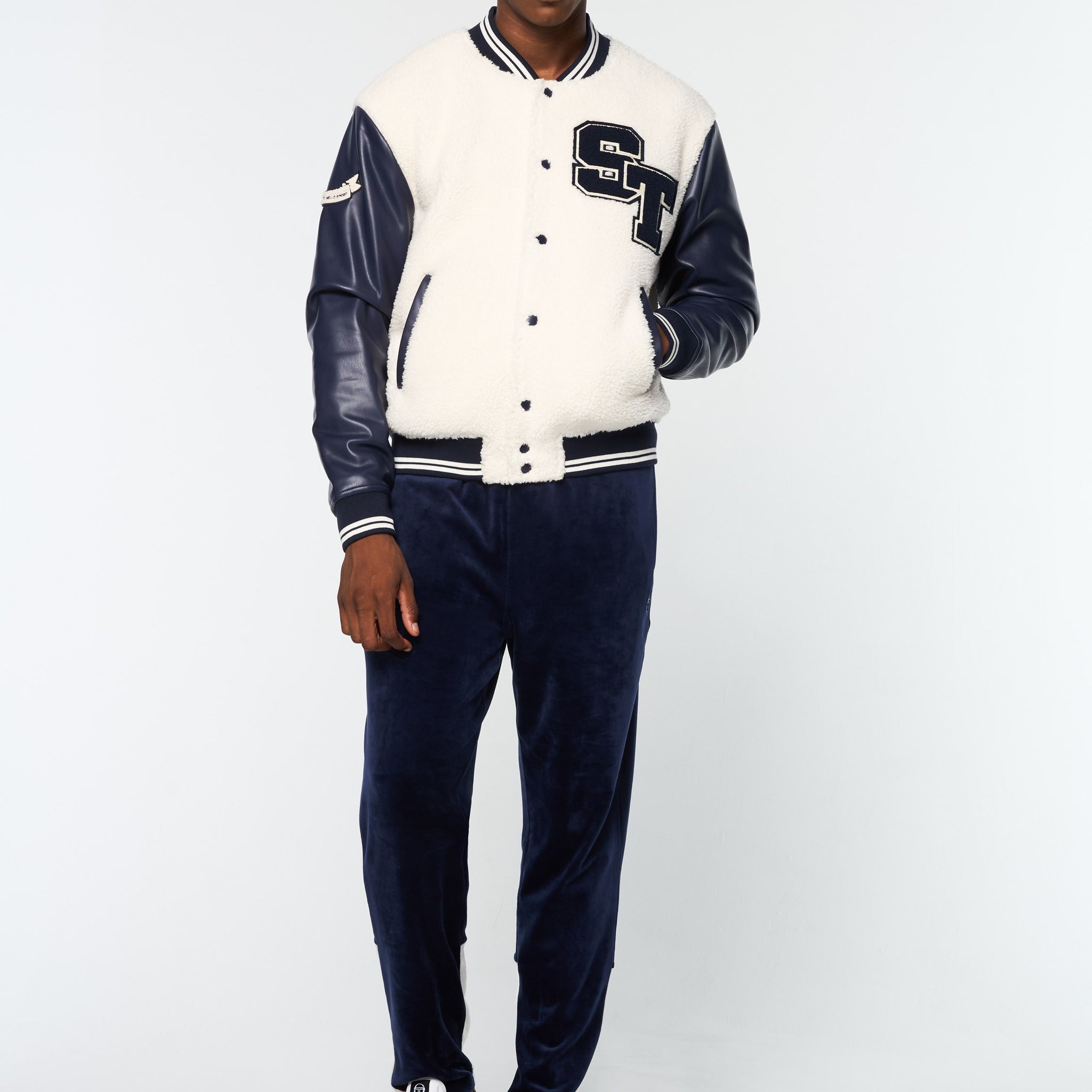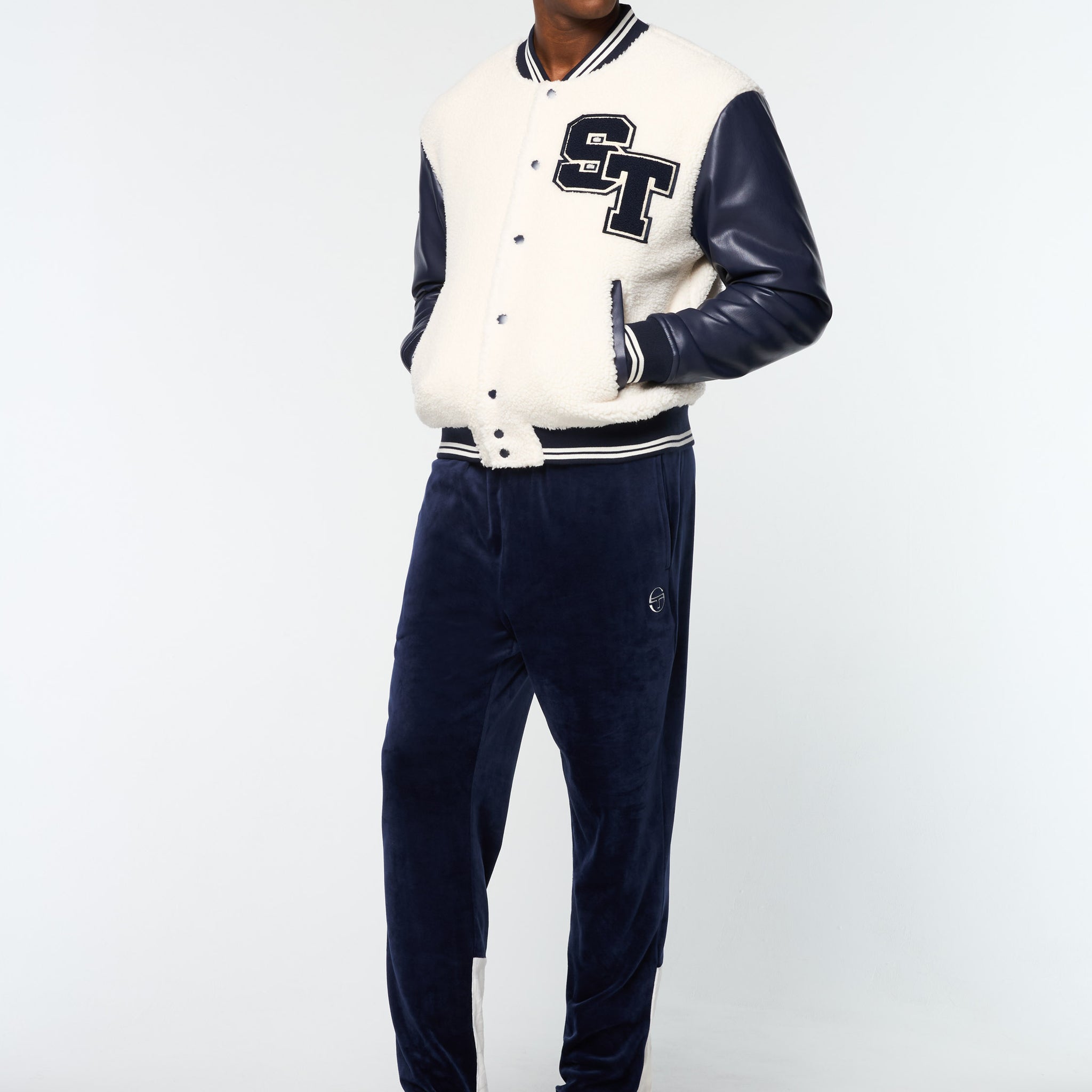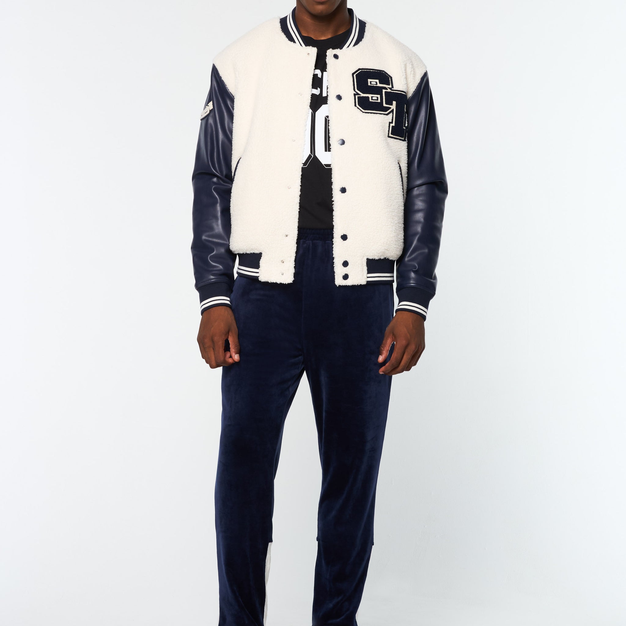 Crafted with a super warm faux sherpa body and faux leather sleeves, the Toppa Varsity Bomber features retro sportswear-inspired logo patches for a Tacchini spin on varsity athletic gear. Cut with a classic snap-button front and striped rib-knit trims, this premium varsity jacket is part of our seasonal “New Ivy” capsule—a contemporary take on collegiate prep aesthetics.