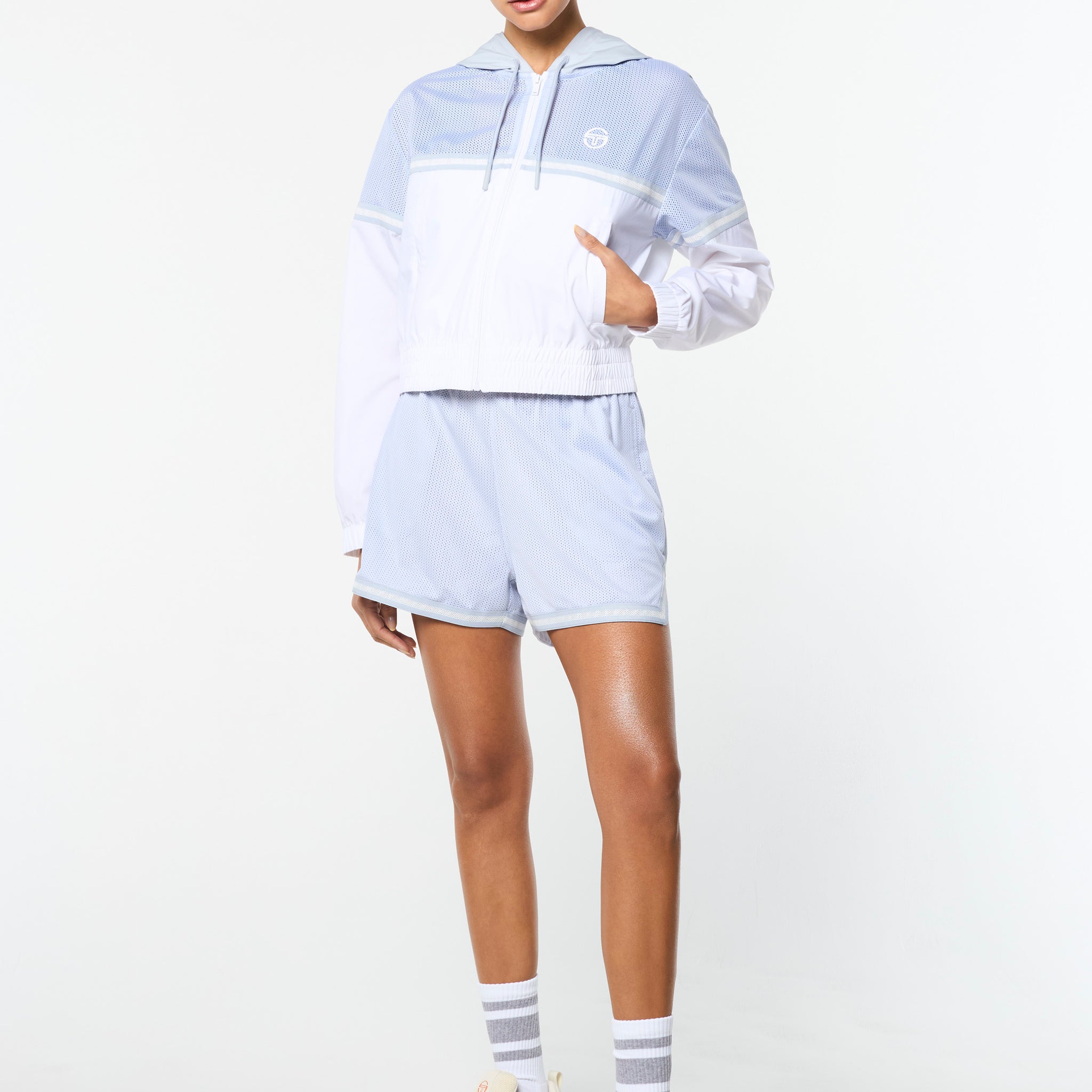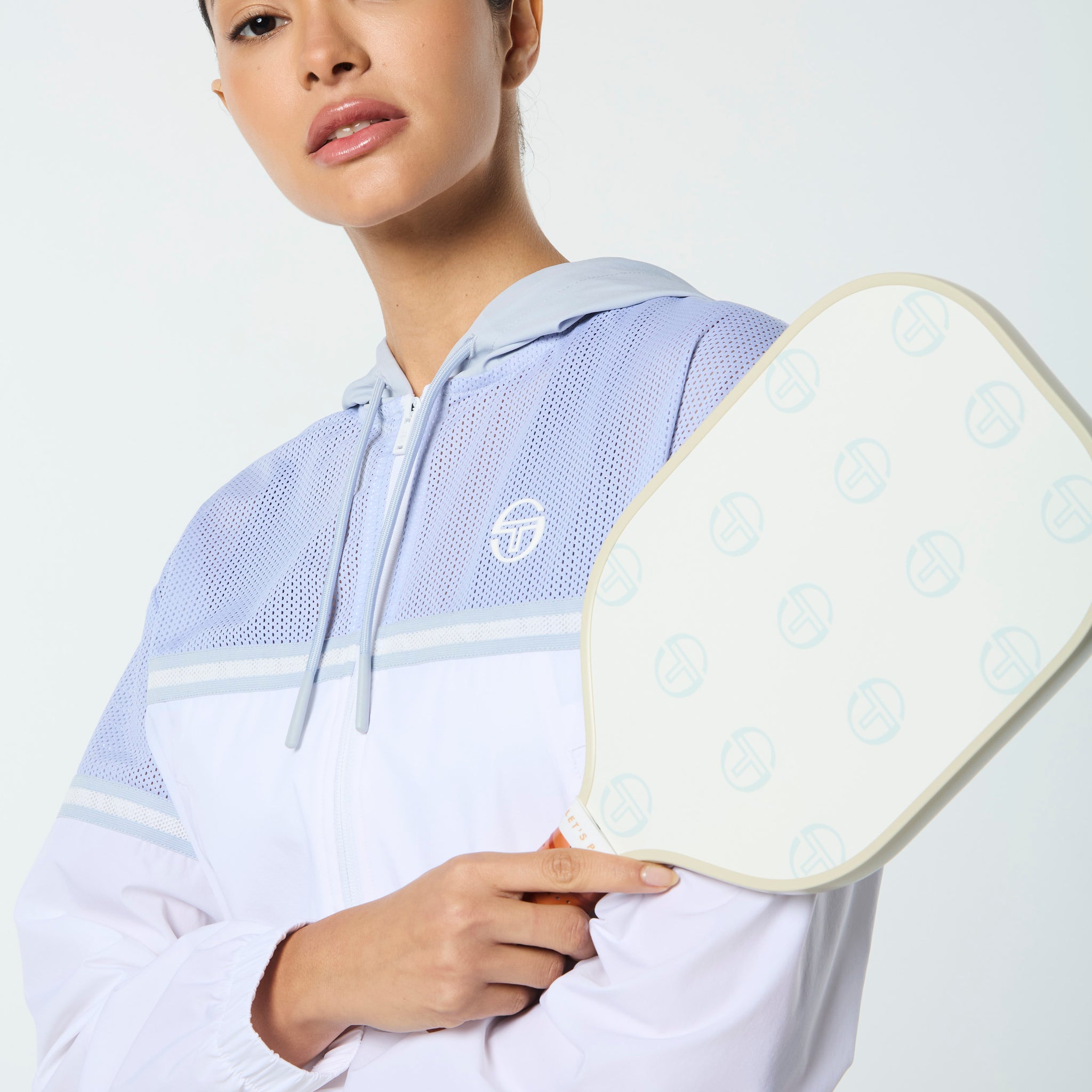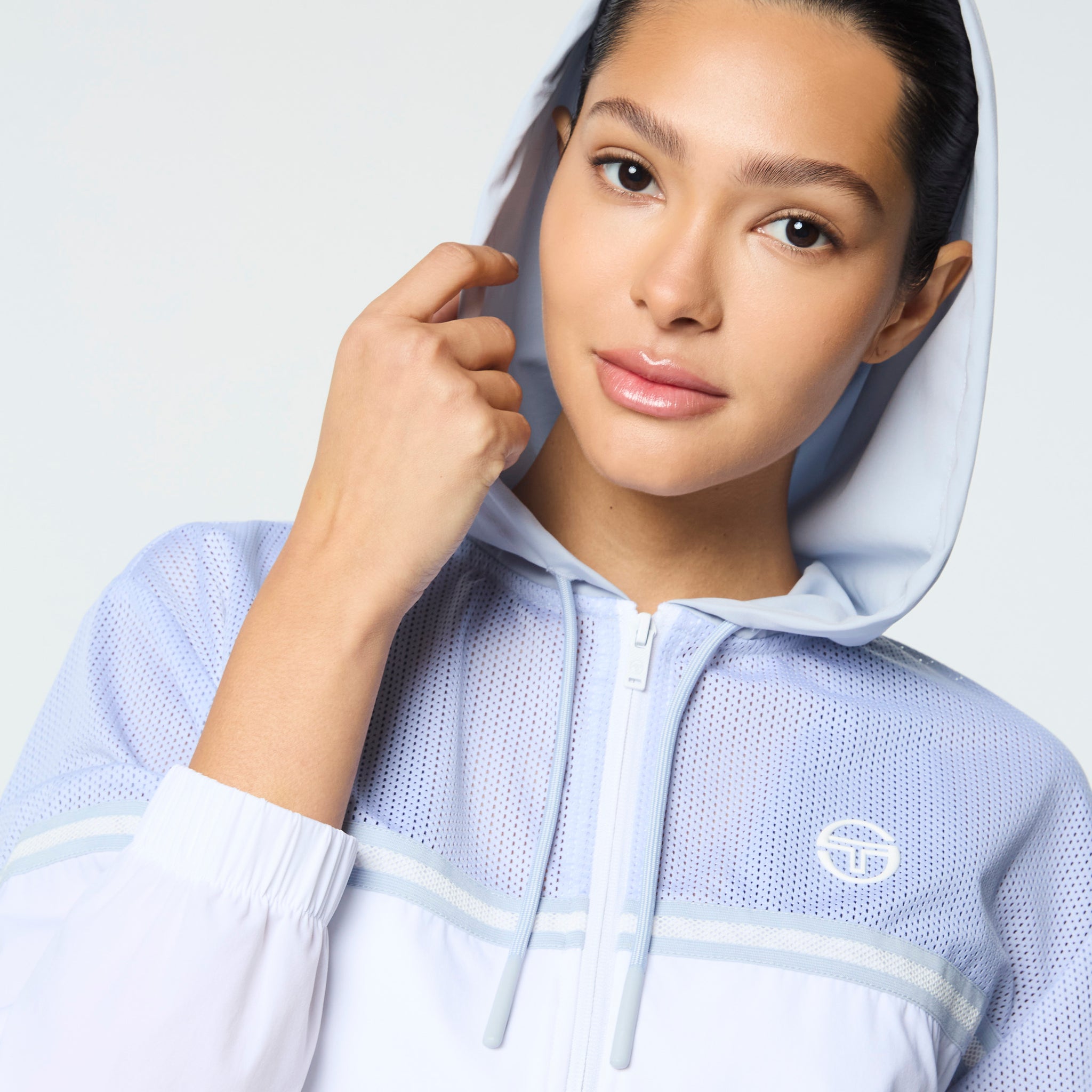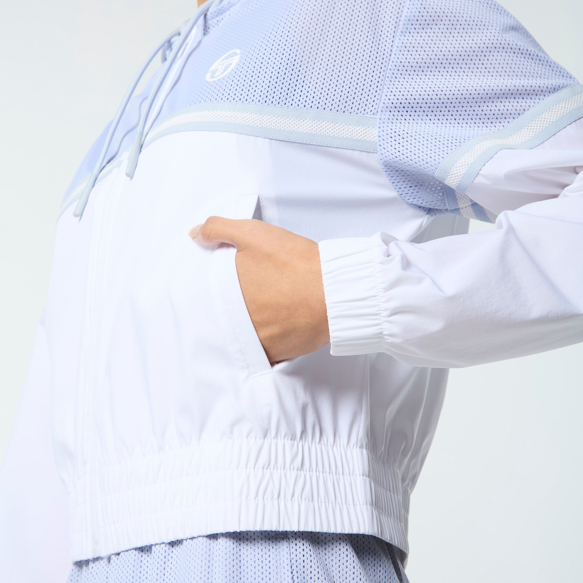 Stay cool on the court with our Angelina Track Jacket, crafted from lightweight performance stretch fabric with eyelet mesh panels to keep you ventilated when practice heats up. Custom “net” trim taping is an homage to classic tennis nets, while a spacious hood and handwarmer pockets complete the fit.