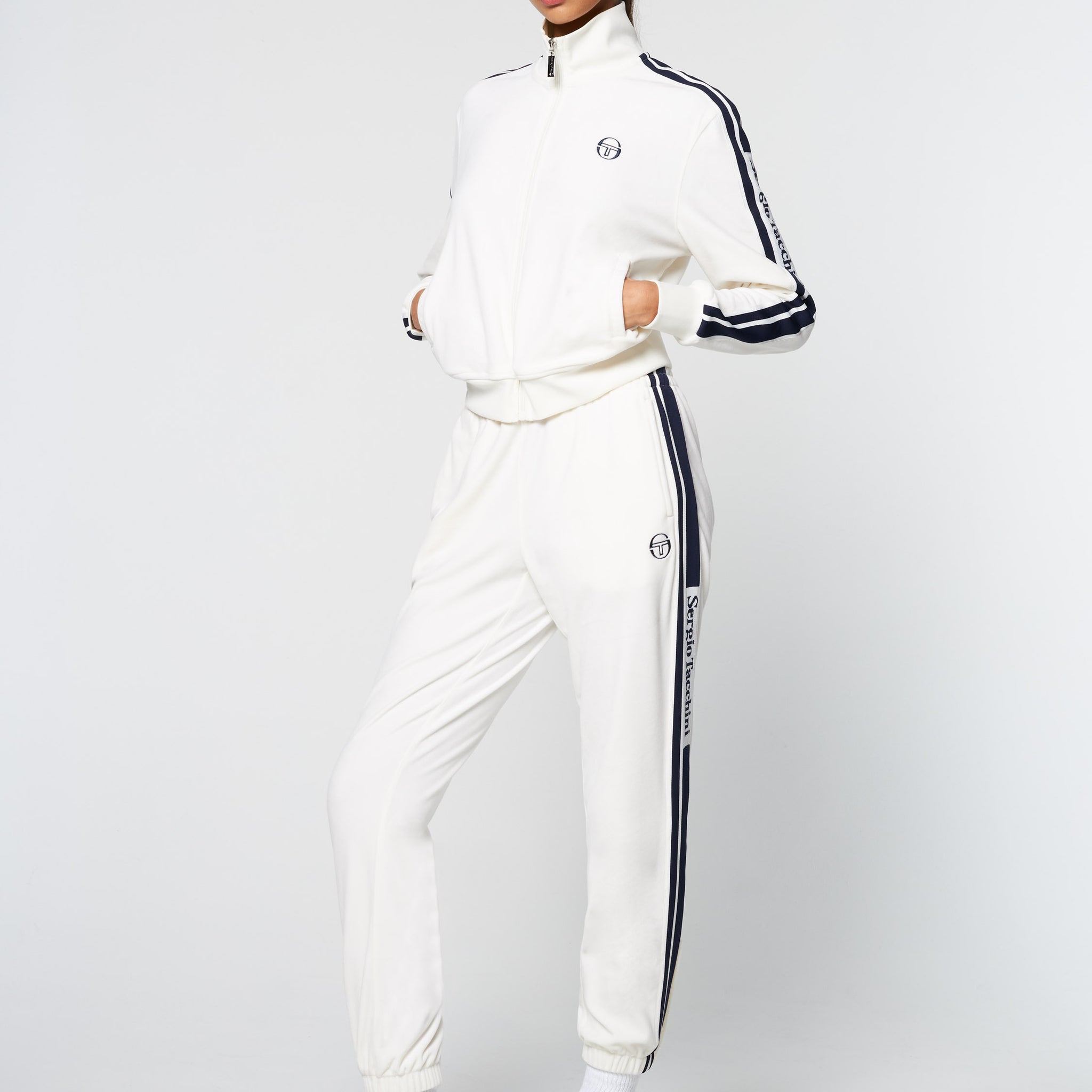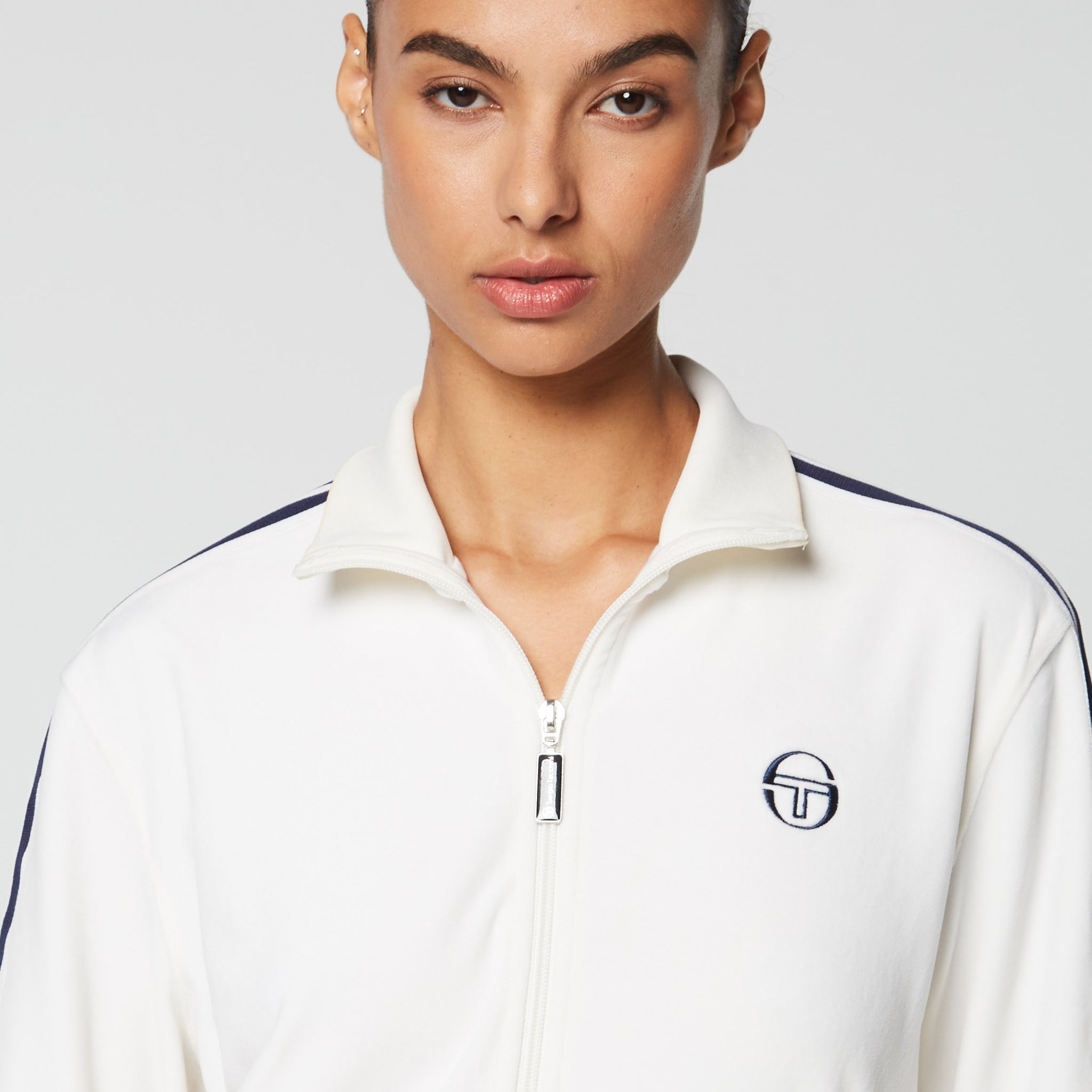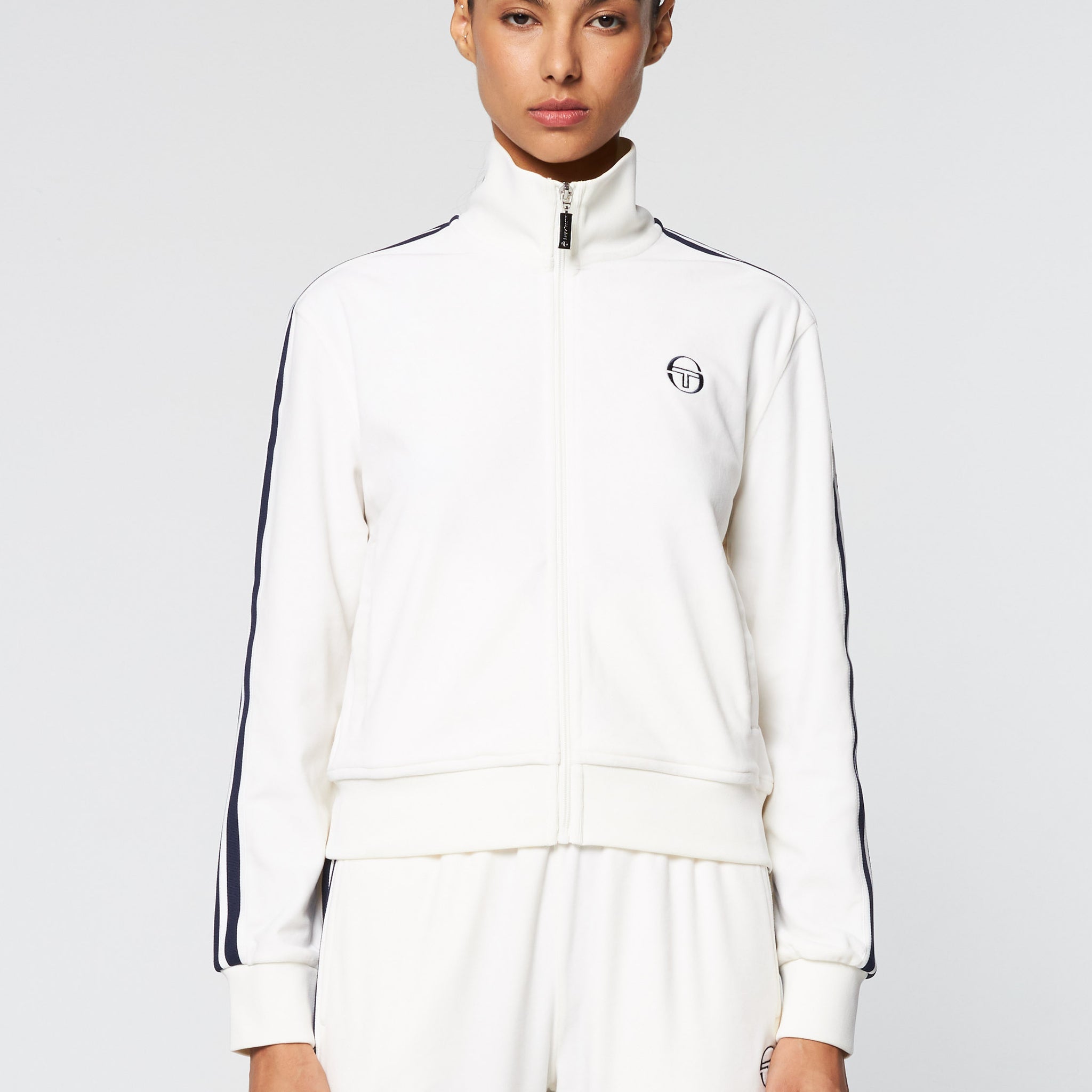 Crafted from plush velour for a soft and luxurious feel, the Atri Velour Track Jacket features Sergio Tacchini-branded stripe taping down the sleeves and our iconic ‘ST’ monogram embroidered at the chest. Cut cropped for easy styling, this elevated for-her fit is finished with spacious pockets and rib-knit trims.