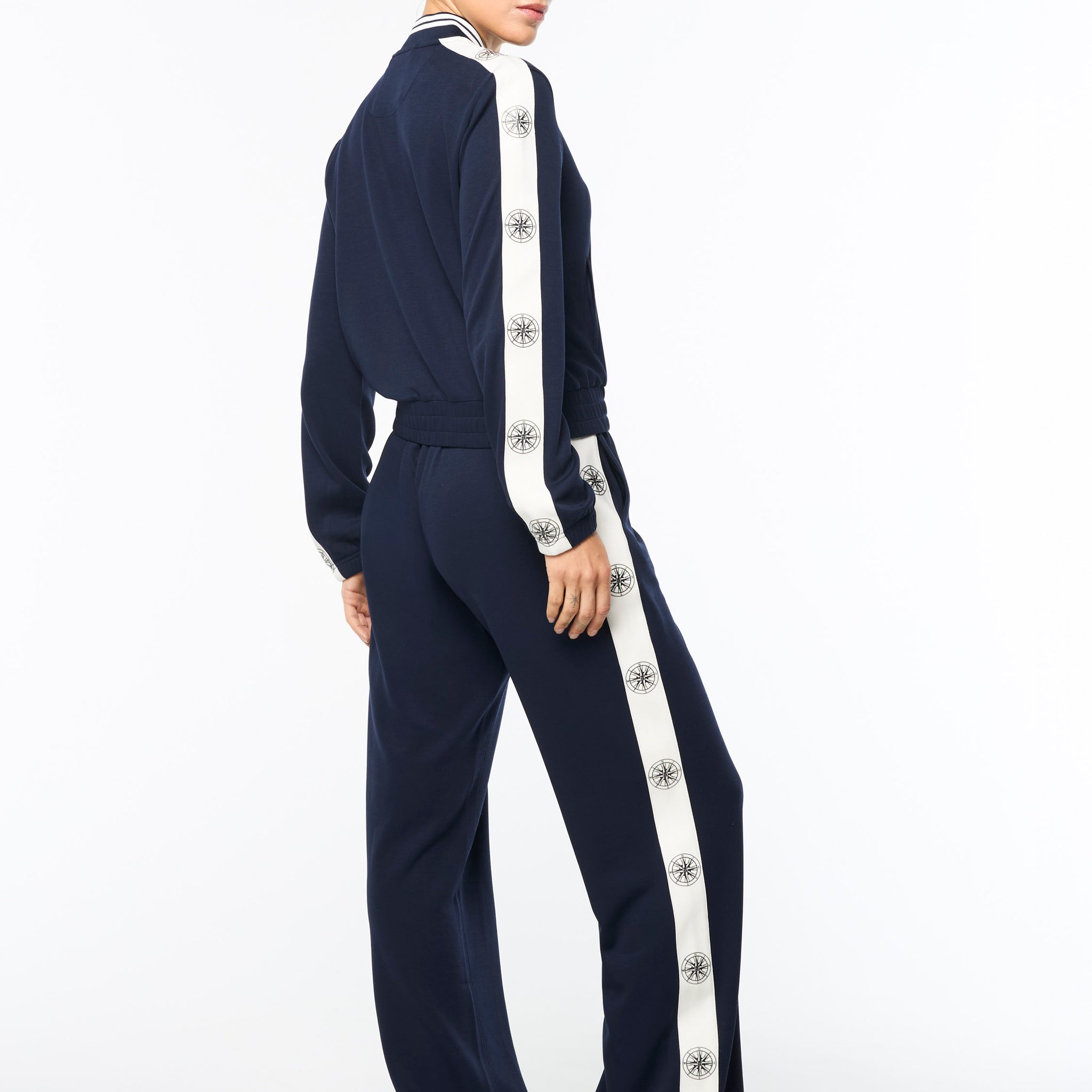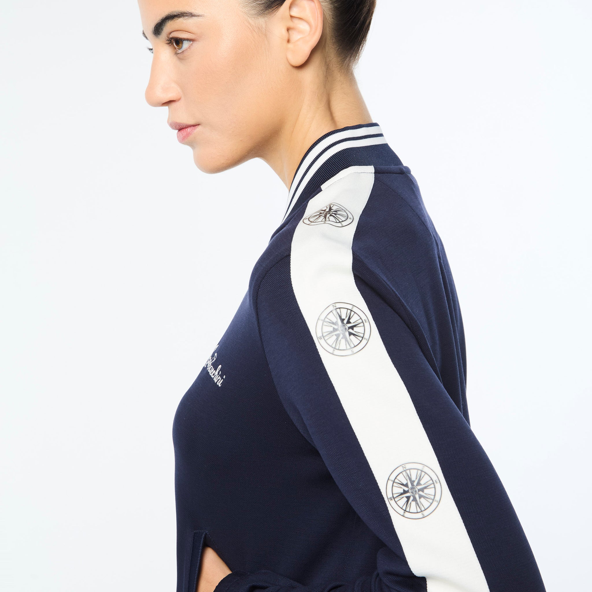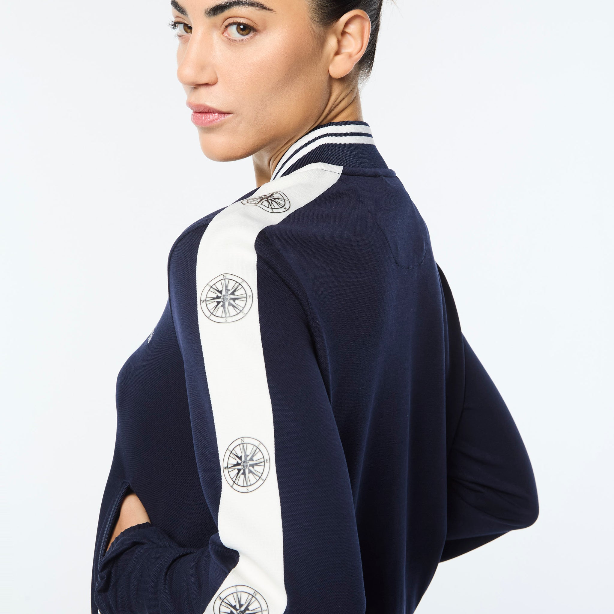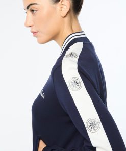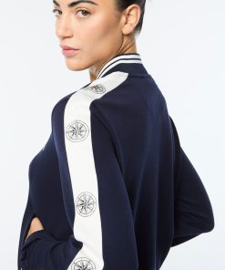 Set sail in our Women’s Bussola Track Jacket, crafted from a luxurious Tencel blend piqué fabric that’s soft and breathable with a subtle stretch—perfect for active individuals and athleisure-wear enthusiasts alike. Featuring nautical stripe accents and a “Compass” rose repeat motif across contrast taping down the sleeves, this refined track jacket offers style and comfort with a Riviera vibe.