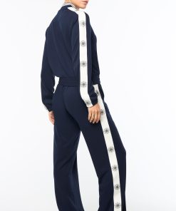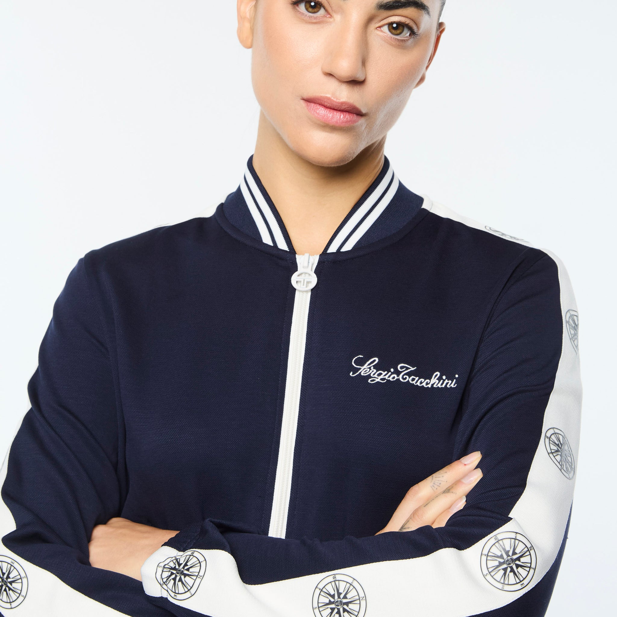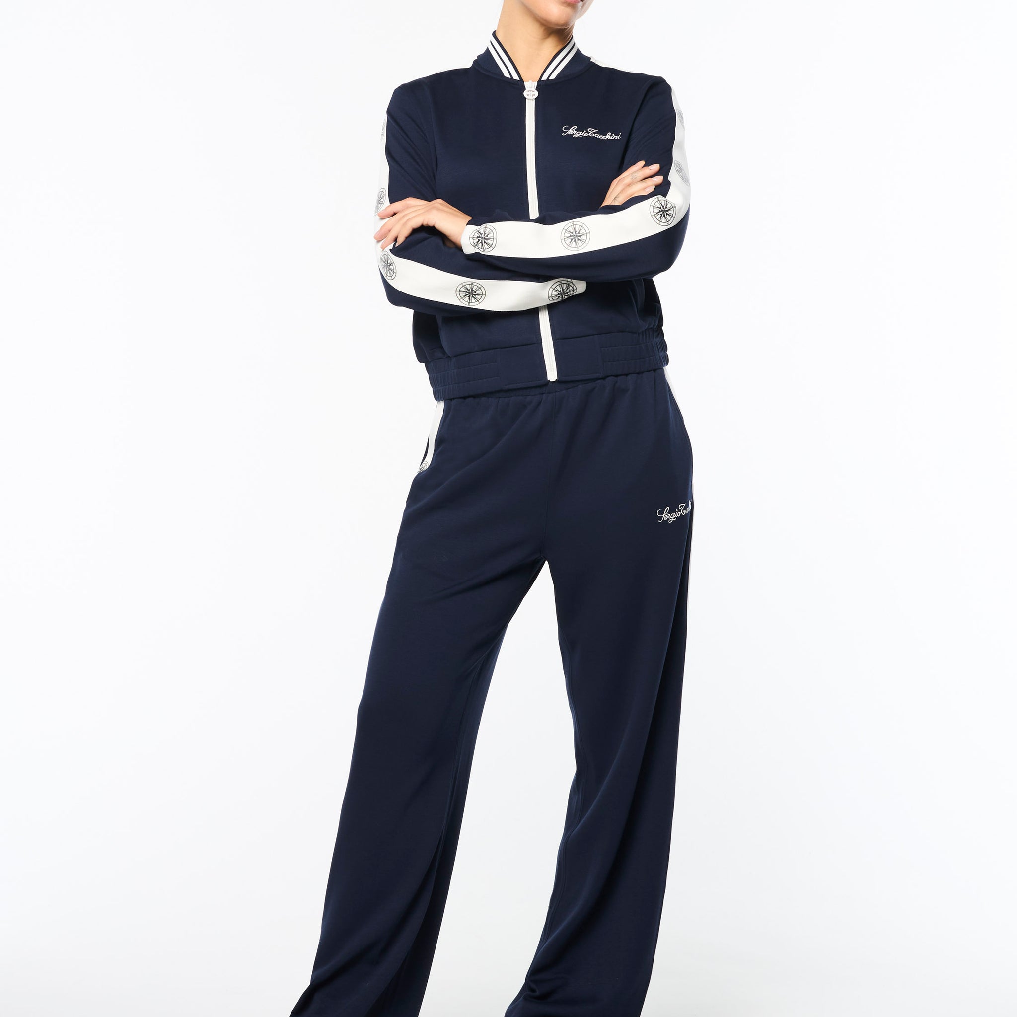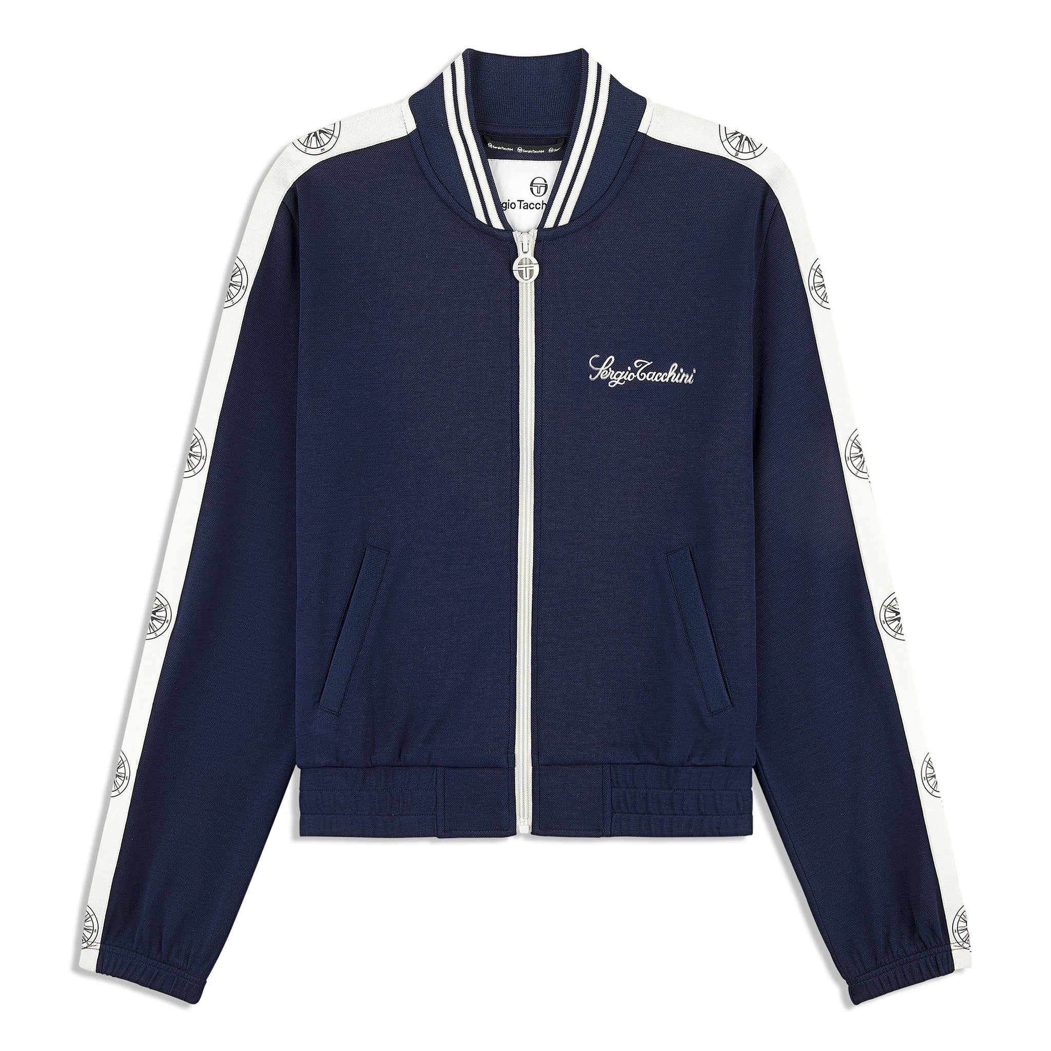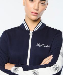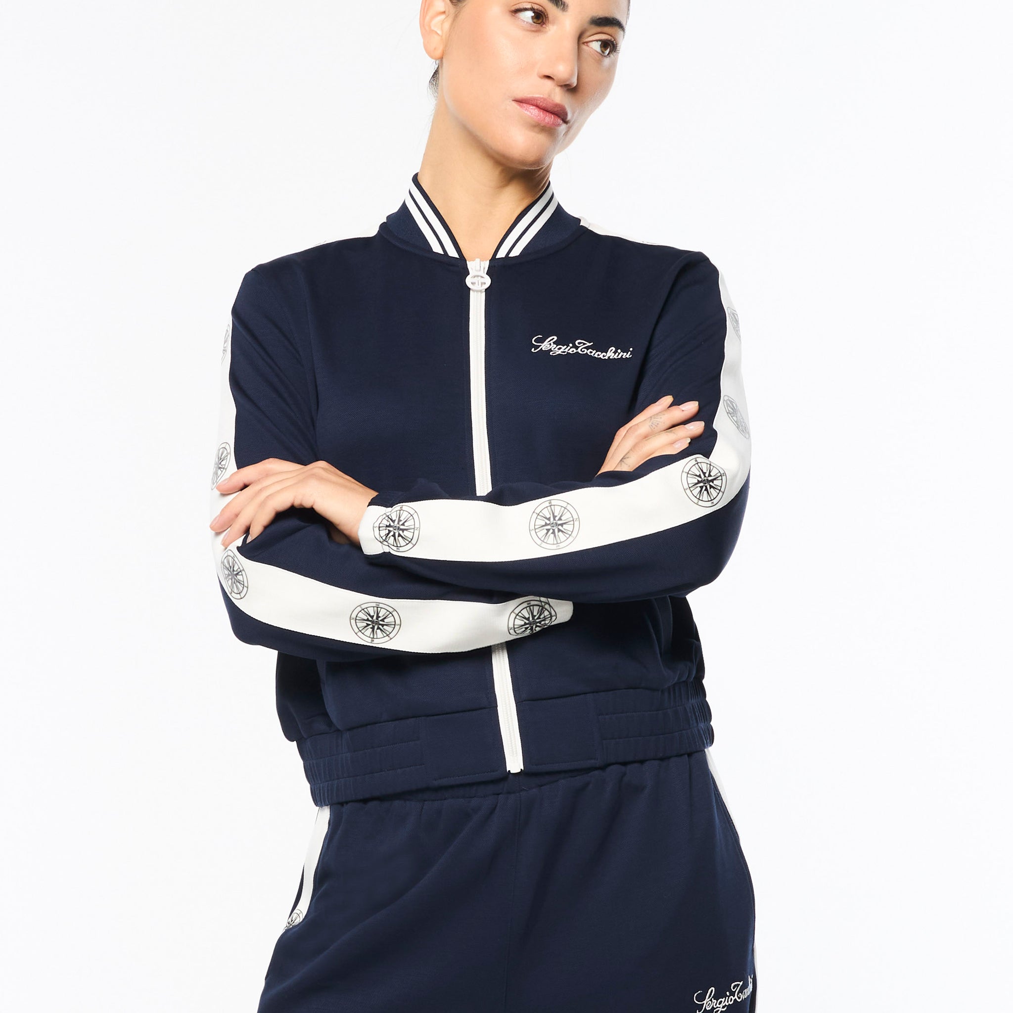 Set sail in our Women’s Bussola Track Jacket, crafted from a luxurious Tencel blend piqué fabric that’s soft and breathable with a subtle stretch—perfect for active individuals and athleisure-wear enthusiasts alike. Featuring nautical stripe accents and a “Compass” rose repeat motif across contrast taping down the sleeves, this refined track jacket offers style and comfort with a Riviera vibe.
