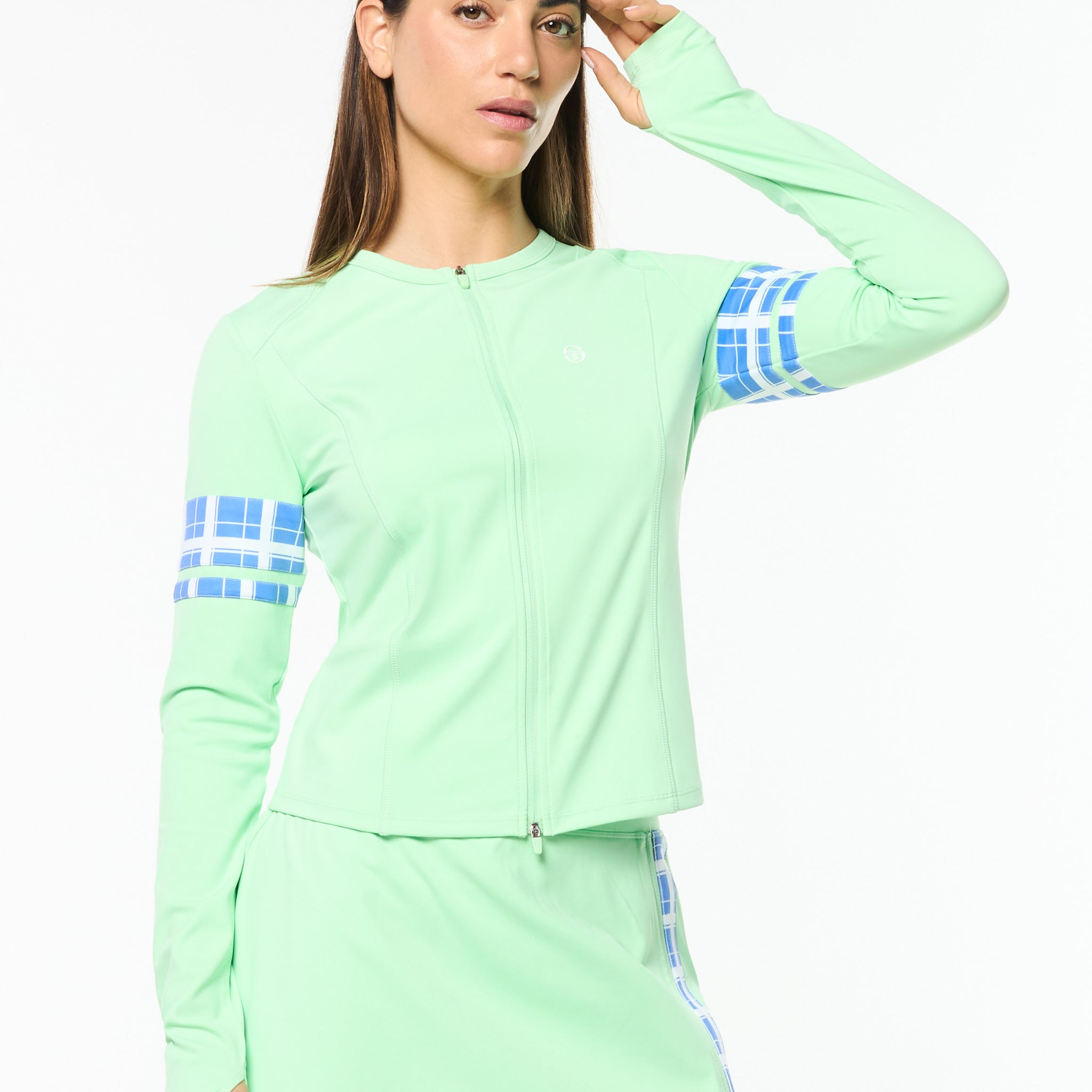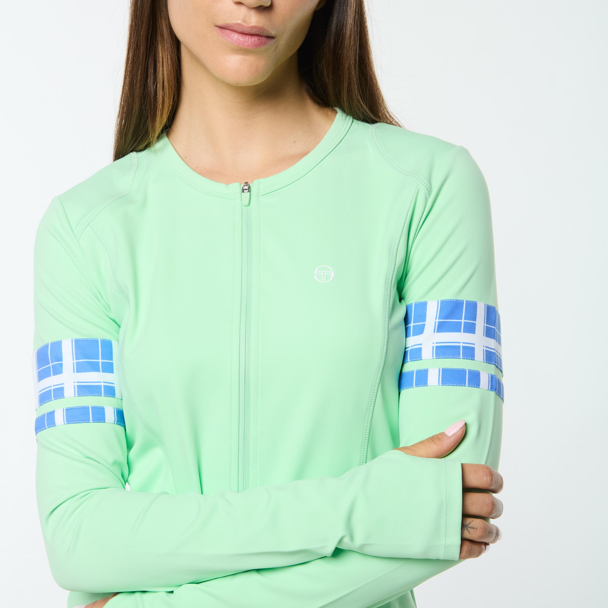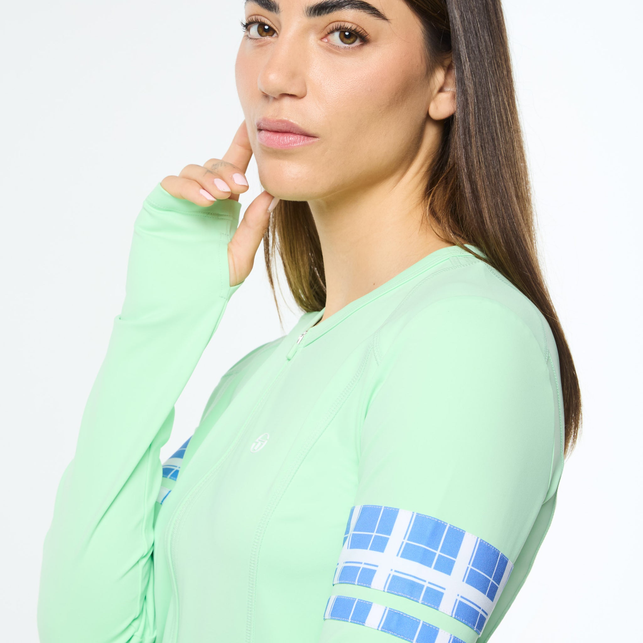 Sleek, sculpted, and built for performance, the Lara Contour Jacket combines athletic function with contemporary style. Crafted from court stretch fabric with moisture-wicking properties, this fitted jacket features princess seams for a flattering silhouette, while custom Damarindo check panels at the sleeves nod to Sergio Tacchini’s heritage. Finished with handy thumbholes for added coverage and a 2-way zipper for versatile styling, it’s the perfect layer for warming up, cooling down, or making a statement off the court.