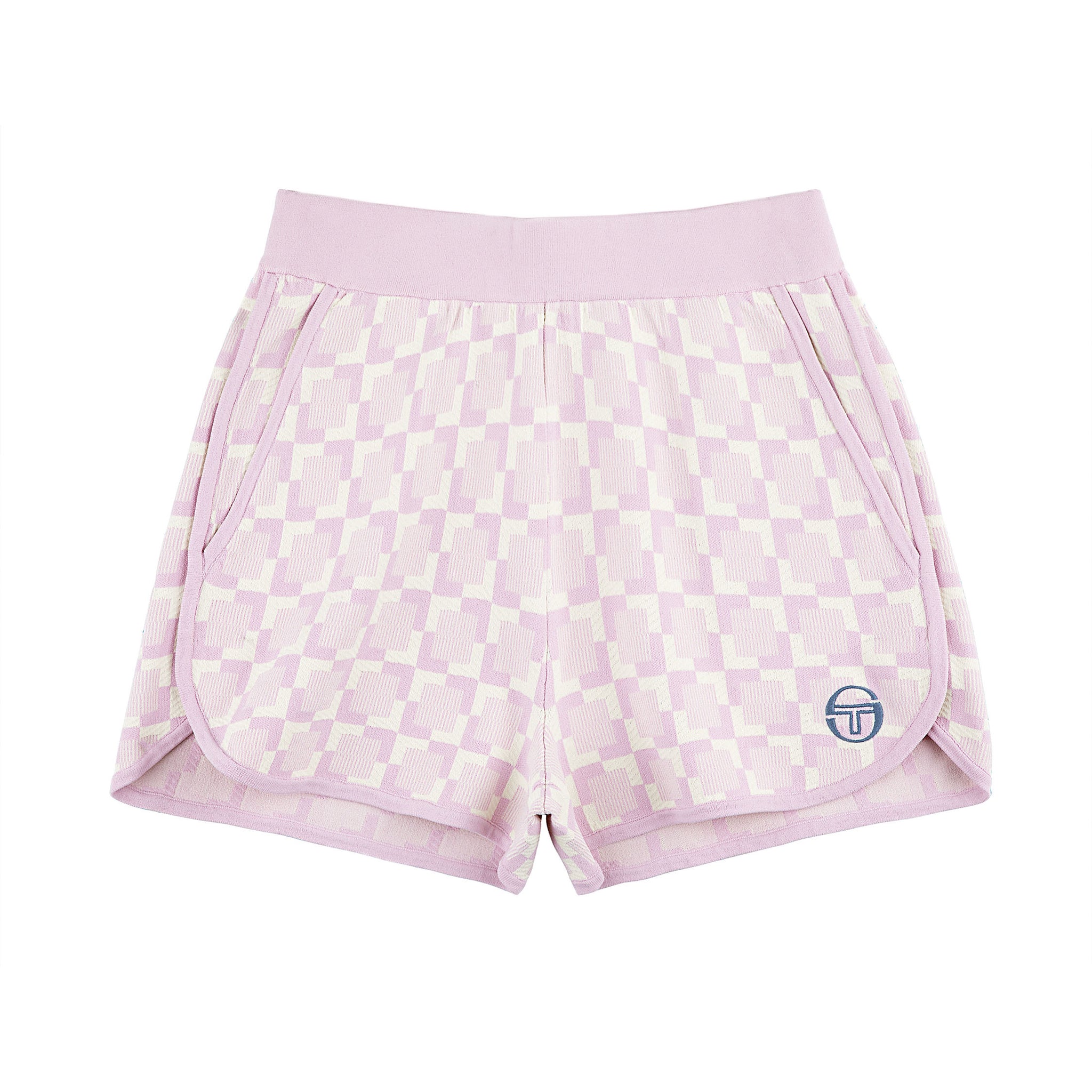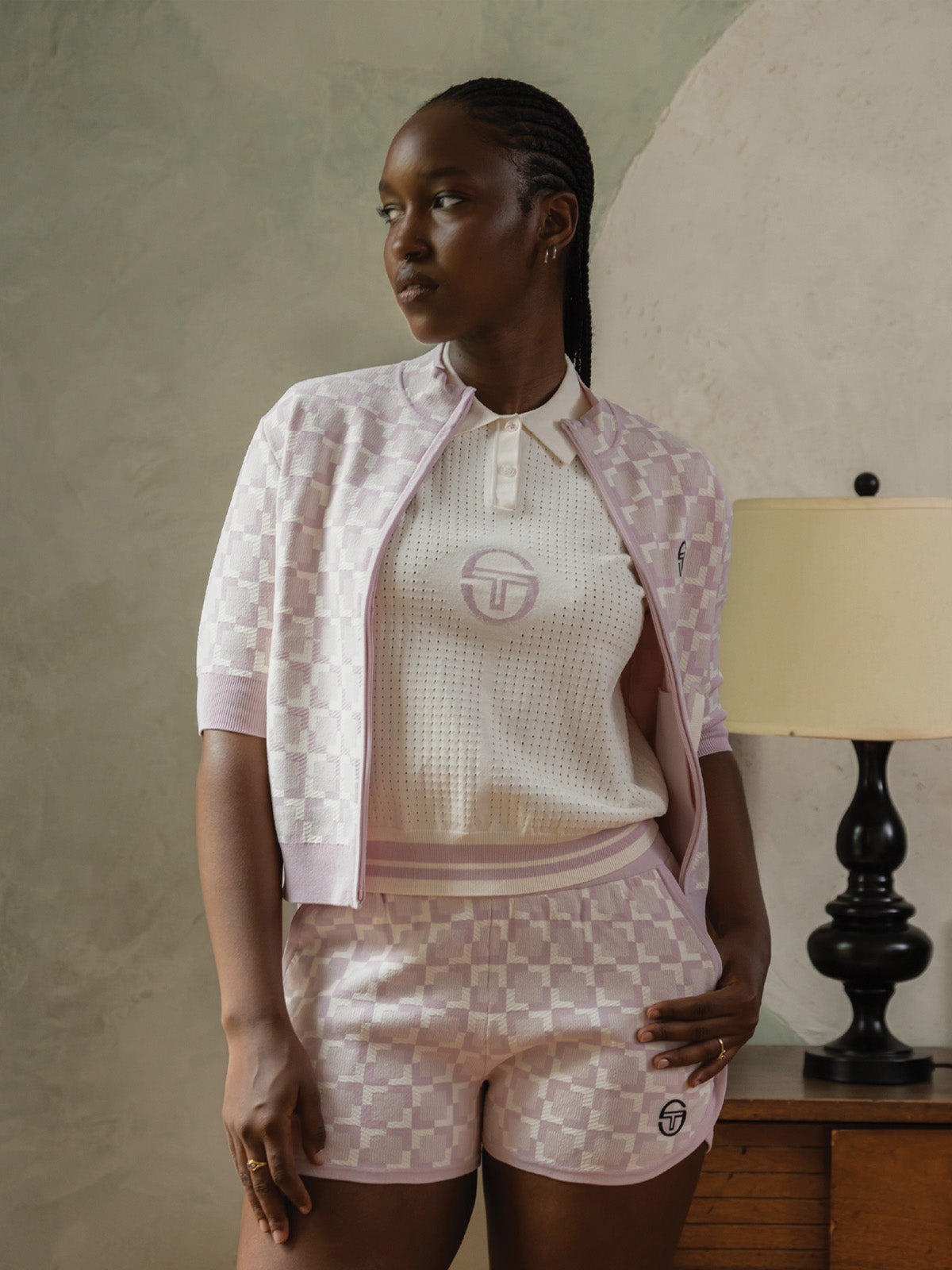 For those who demand style and quality without compromise. The Leila Short is expertly crafted from a luxurious matte viscose and elite fiber blend that’s lightweight and breathable with a sturdy handfeel knit using an intricate birdseye-back jacquard technique, these elevated shorts feature an all-over geometric motif and contrast binding at the rounded dolphin hem for a retro vibe.